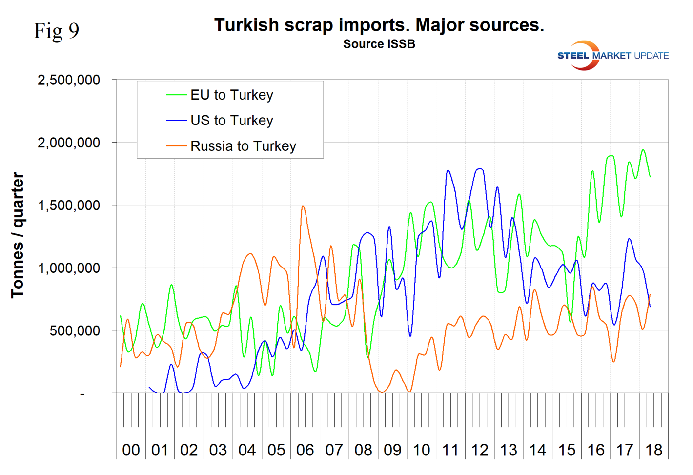 Turkey’s import tonnage declined in 2015 and bounced back strongly in Q3 2017 to an all-time high of 5.9 million tons. In each of the last three quarters, Turkish imports have declined. The EU has increasingly strengthened their position as a supplier to Turkey since mid-2015, and in the latest data Russia replaced the U.S. in second place. This was the first time for Russia’s scrap exports to Turkey to exceed the U.S since Q4 2007 (Figure 9).