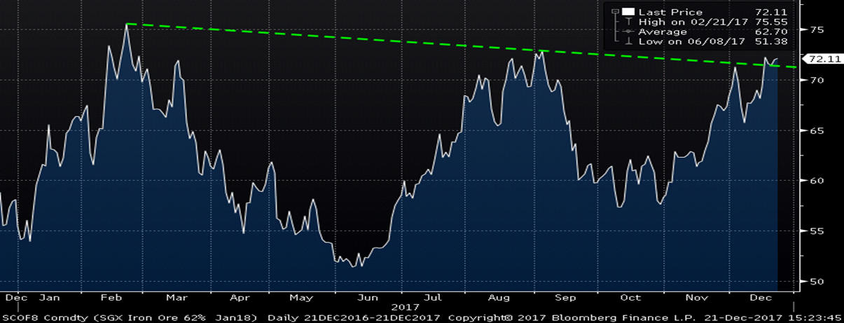Since we last met two Thursday’s ago, activity in the ferrous futures markets has continued to be fast and furious. The January SGX iron ore future has rallied another $6.39/t or 9.7 percent to $72.11/t in that time. The January SGX ore future’s price has now broken above the downtrend (green line) that began after peaking in late February.