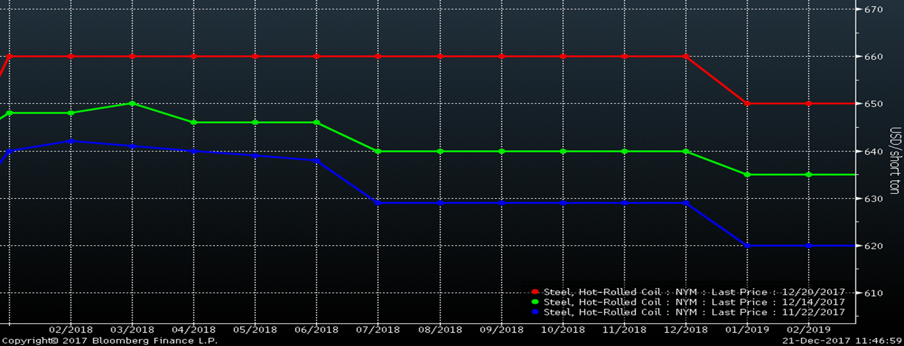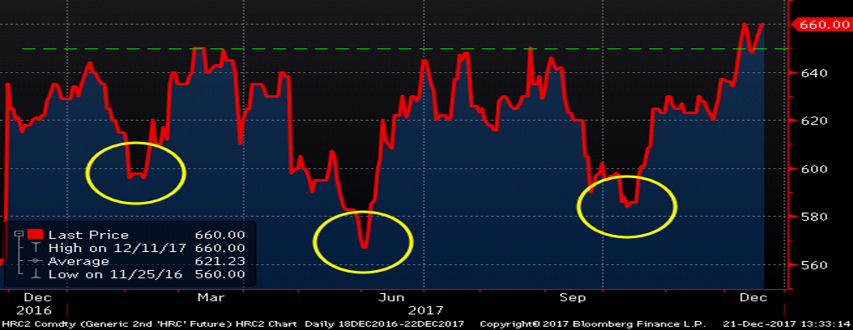 Over the last two weeks, the CME January Midwest HRC future has rallied $15/st or 2.3 percent to $660 and traded as high as $667 a week ago Monday following the $680 price increase announcement from ArcelorMittal. The entire curve has traded higher and is flat with a number of trades at $660 for time periods throughout 2018 and as far out as November.