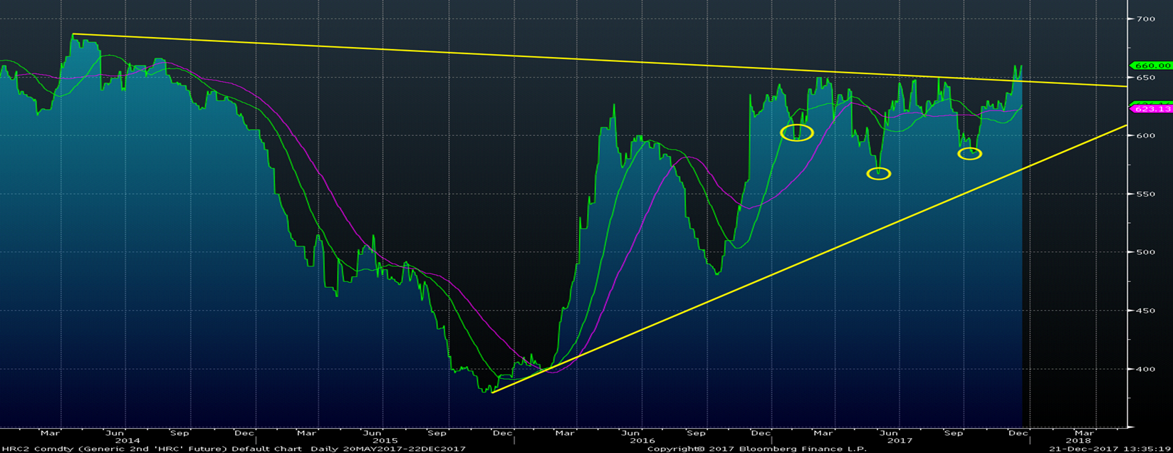 The two charts below are of the rolling 2nd month HRC futures price. The 2nd month “rolling” futures is created by combining each of the 2nd month futures contracts through time. For instance, during the month of November, it is the December future. If the rolling 2nd month HRC future price breaks above the $650 “neckline,” this chart pattern indicates a significant rally to follow.