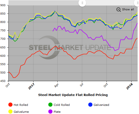 SMU Note: Below is a graphic showing our hot rolled, cold rolled, galvanized, Galvalume, and plate price history. To use the graph’s interactive capabilities, you must view it on our website here. If you need help navigating the website or need to know your login information, contact us at info@SteelMarketUpdate.com or 800-432-3475.