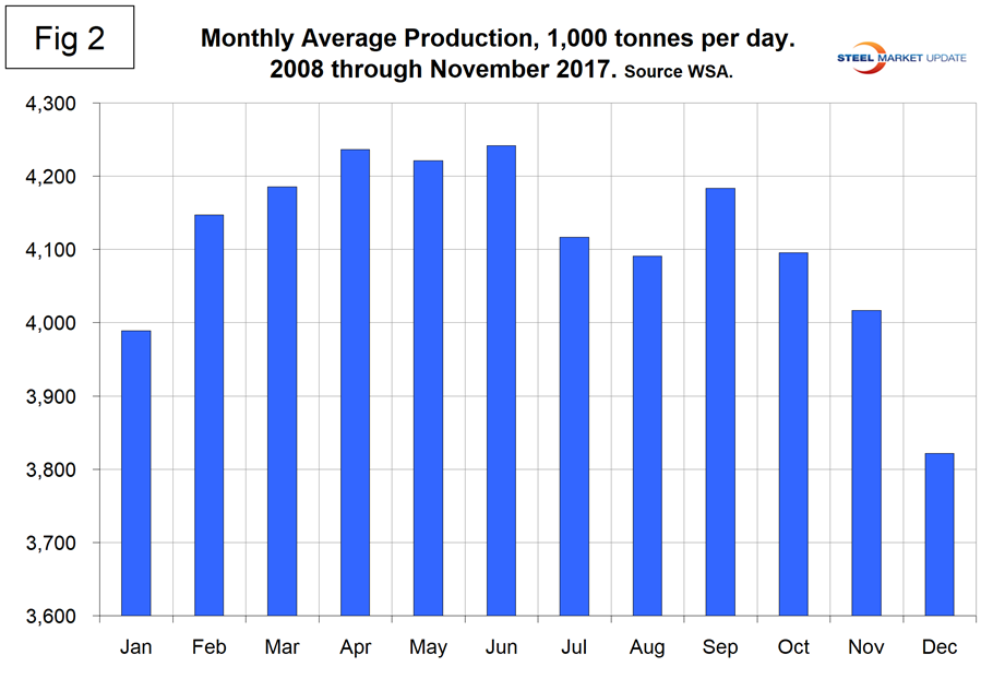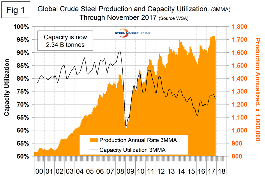 The summer slowdown that has occurred in each of the last seven years was delayed until November this year. On a tons-per-day basis, production in November was 4.543 million metric tons with a 3MMA of 4.649 million metric tons, which was not far off the all-time high in June of 4.695 million metric tons. In three months through November, production was up by 4.6 percent year over year. On a 3MMA basis, capacity utilization was on an erratically downward trajectory from mid-2011 through February 2016 when it bottomed out at 65.5 percent. There has been a 6.5 percent increase since then. In each of the last nine months, the 3MMA of capacity utilization has been greater than 72 percent for the first time since June 2015. Last November, the OECD’s steel committee estimated that global capacity would increase by almost 58 million metric tons per year between 2016 and 2018 bringing the total to 2.43 billion tonnes. That forecast is coming to pass as capacity is now 2.34 billion tons.