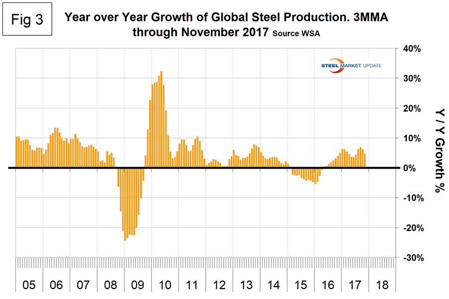 Global steel production grew by 4.6 percent in the three months through November year over year with negative momentum, according to Steel Market Update’s analysis of World Steel Association data. The reduced growth rate was driven by pollution control cutbacks in China.