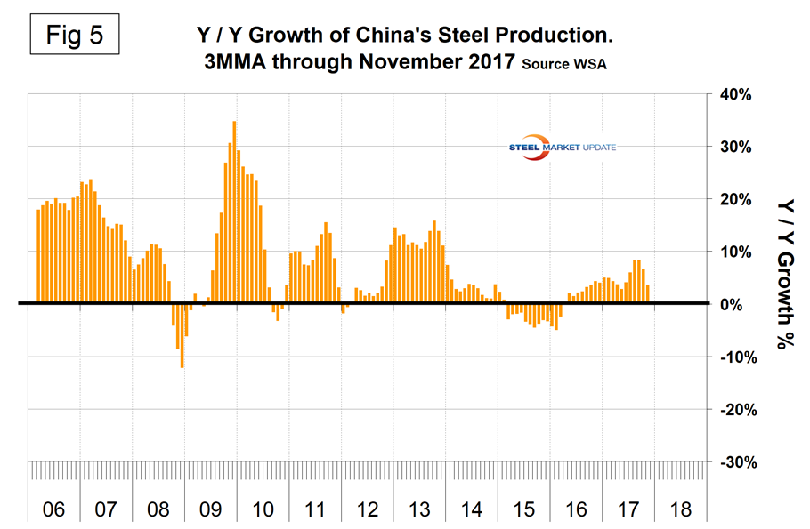 Figure 4 shows China’s production since 2005 and Figure 5 shows the year-over-year growth. China’s production after slowing for 13 straight months returned to positive growth each month in May 2016 through November this year. Platts reports that Tangshan, China’s biggest steelmaking city, began the well-publicized steel output cuts on Nov. 15 in an attempt to improve air quality in Beijing, Tianjin and 26 surrounding cities.