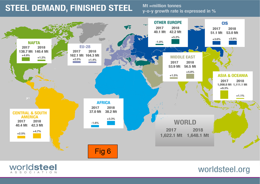 The World Steel Association Short Range Outlook for apparent steel consumption in 2017 and 2018 was revised and published on Nov. 14 (Figure 6). Commenting on the outlook, T.V. Narendran, chairman of the World Steel Economics Committee, said: “Progress in the global steel market this year to date has been encouraging. We have seen the cyclical upturn broadening and firming throughout the year, leading to better than expected performances for both developed and developing economies, although the MENA region and Turkey have been an exception. The risks to the global economy that we referred to in our April 2017 outlook, such as rising populism/protectionism, U.S. policy shifts, EU election uncertainties and China deceleration, although remaining, have to some extent abated. This leads us to conclude that we now see the best balance of risks since the 2008 economic crisis. However, escalating geopolitical tension in the Korean peninsula, China’s debt problem and rising protectionism in many locations continue to remain risk factors. In 2018, we expect global growth to moderate, mainly due to slower growth in China, while in the rest of the world steel demand will continue to maintain its current momentum.”