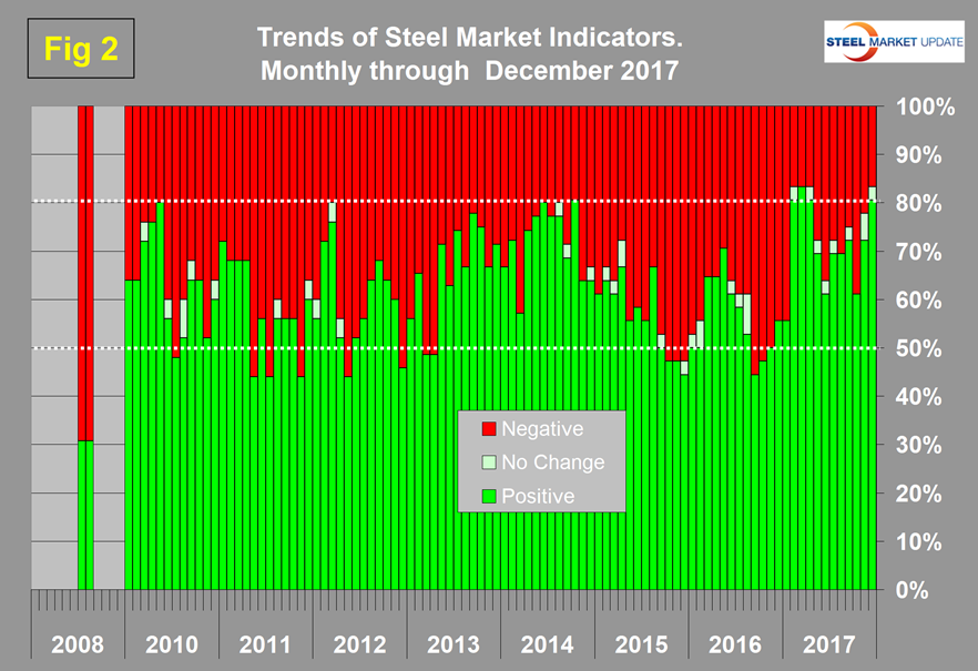 Key market indicators bode well for business conditions in the first quarter of 2018. Steel Market Update’s view of the present situation based on our examination of data released in December shows that 47.2 percent of the 36 indicators are historically positive with only 19 percent negative. The balance is within the historically normal band. The total of positive and normal has not changed in six months. However, there have been frequent changes in the detail. Trends improved with 80.6 percent of the indicators heading in a positive direction, up from 61.1 percent in October and from 72.2 percent in November. Trends lead the present situation by about four months.