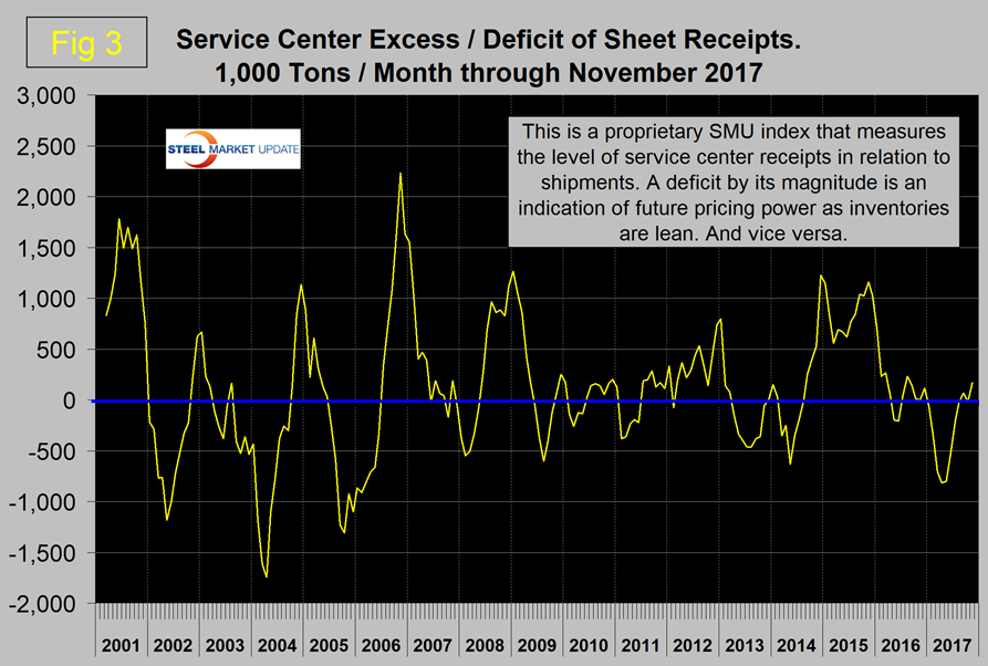 Our observations about trends in the December data are as follows: In the General Economy section of Table 1, there were no tend reversals. All indicators except the value of the U.S. dollar trended positive in December. The dollar strengthened, which we regard as negative because of the effect on the trade balance. Both the SMU proprietary indexes reversed direction. Service center excess of sheet products became increasingly negative through April this year when it reached negative 816,000 tons. Since then, the deficit declined and became positive 170,000 tons in the November data. This is a proprietary SMU calculation. We regard an inventory deficit to be positive in terms of pricing power, therefore we are presently in a situation of negotiation neutrality (Figure 3).