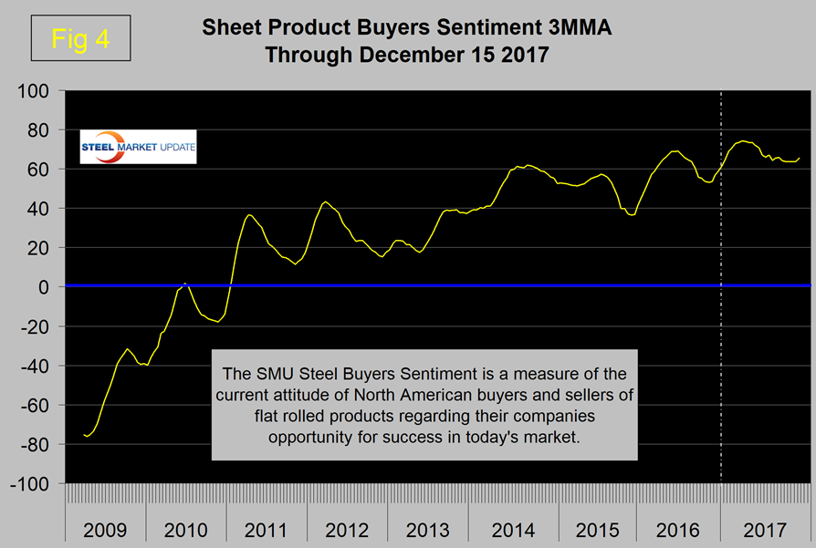The steel buyer’s sentiment reversed direction in December, trended positive and maintained its historically very high level (Figure 4). There was a positive shift in raw materials prices when Chicago shredded and zinc both reversed direction and trended positive in December. We regard rising raw materials prices as positive and indicative of a strengthening market.