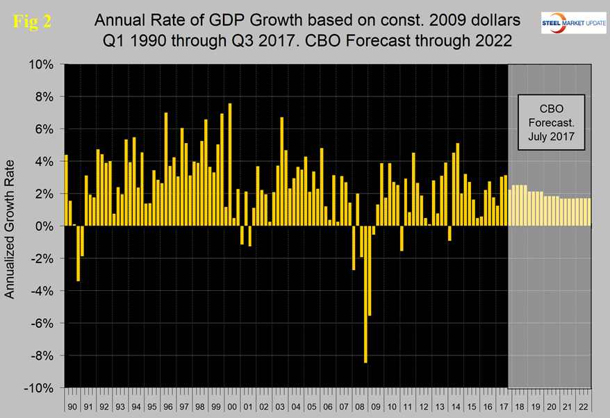 Figure 2 shows the headline quarterly results since 1990 and the July Congressional Budget Office forecast through 2022. The IMF forecasts global and national economic growth each April and October. In their October update, the forecast of U.S. economic growth was revised down for each year through 2022. Growth in 2017 was revised down from 2.31 percent in the April estimate to 2.18 percent, and down from 2.52 percent to 2.34 percent in 2018.