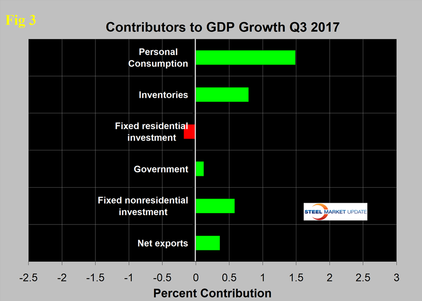 Figure 3 shows the change in the six major subcomponents of GDP in Q3 2017. Normally, personal consumption is the dominant growth driver, and this continued to be the case in the third quarter. Personal consumption includes goods and services, the goods portion of which includes both durable and non-durables.