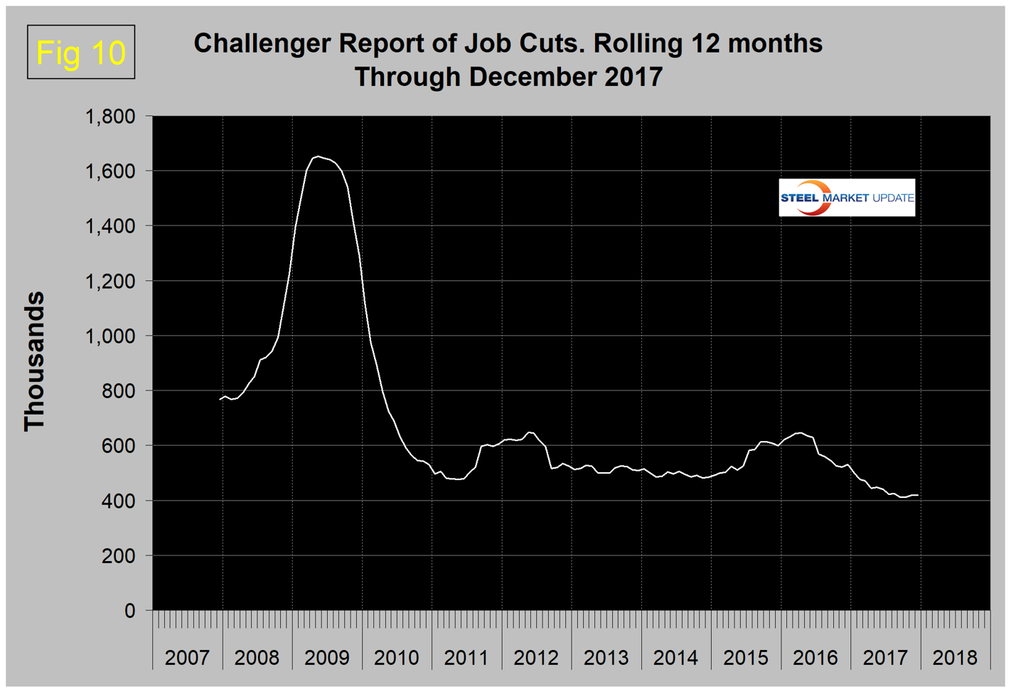 The last piece of the employment puzzle is the Challenger report, which measures monthly job cuts (Figure 10). This data also tends to be quite erratic. Therefore, we again examine a rolling 12 months and can see that job cuts decreased for most of 2016 and continued their downward trend in 2017.