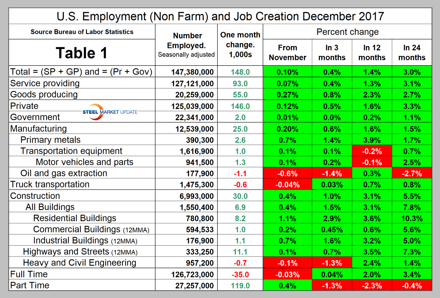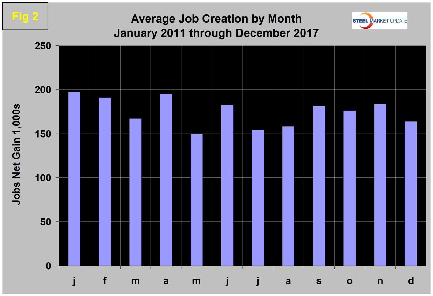 In December, service industries expanded by 93,000 as goods-producing industries, driven mainly by construction and manufacturing, expanded by 55,000. This was the silver lining as the steel-consuming sectors both did well in December. Construction gained 30,000 compared to a monthly average of 16,000 in the first 11 months of the year, and manufacturing gained 25,000, also compared to an average 16,000-job gain. Since February 2010, service industries have added 15,015,000 and goods-producing 2,632,000 positions. This is part of the reason why wage growth has been slow since the recession, as service industries on average pay less than goods-producing industries such as manufacturing.