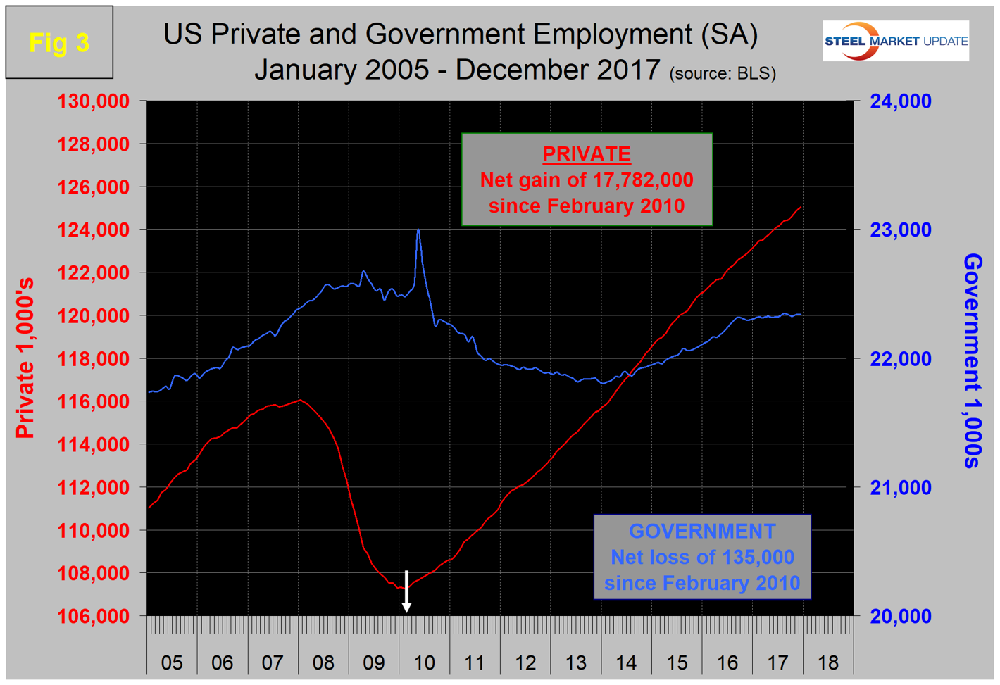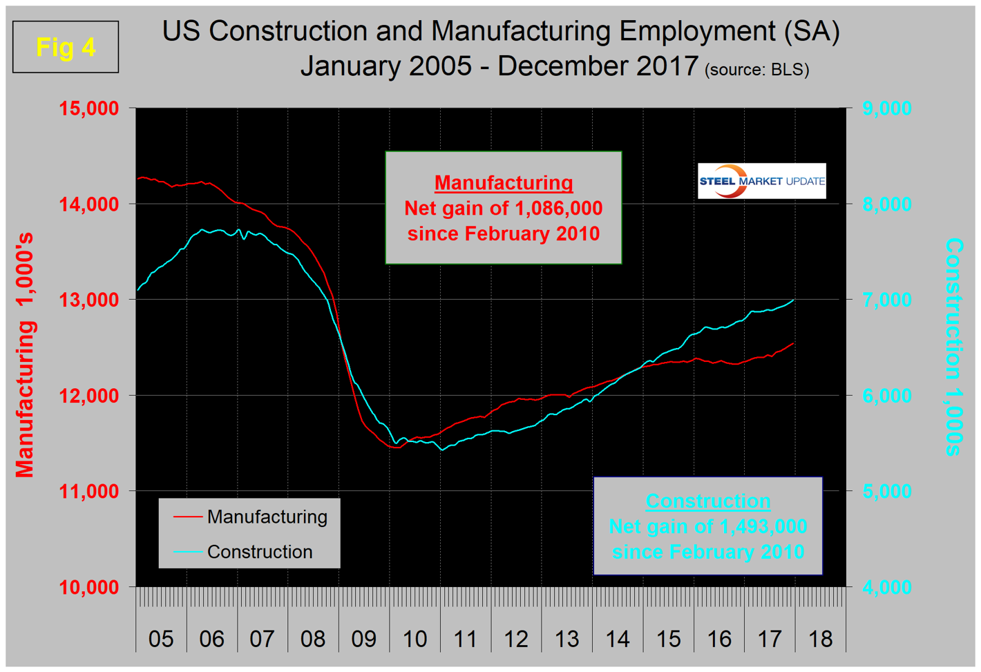 SMU Comment: Rising employment and wages are the basis of GDP growth because personal consumption accounts for almost 70 percent of GDP. Steel consumption is related to GDP, therefore to get a handle on this driver we need to be aware of changes to the employment picture. As we close out 2017, the employment situation is good, job openings are close to an all-time high, and new claims for unemployment are at a 44-year low. Manufacturing employment is 1.6 percent higher than this time last year, and construction employment is up 3.1 percent. The employment situation has been described as “full” by some analysts. December was the 85th consecutive month of job growth, but Figure 1 shows a slowing trend since the middle of 2014. If as reported there is a shortage of qualified employees, we can expect an increase in wage-driven inflation in the near future. The results for manufacturing and construction are sign posts for steel sales activity. 2018 is starting from a strong base.