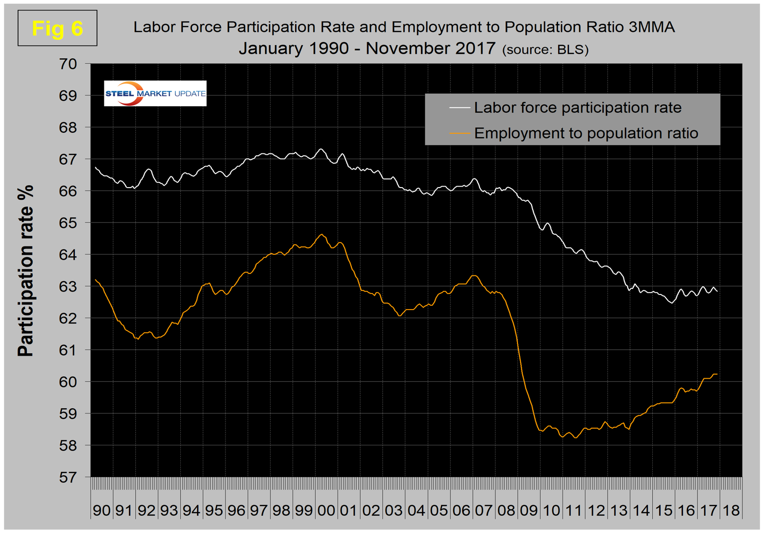 The employment participation rate at 62.7 percent in December was the same as October and November. We’re not sure what this is a percentage “of” because of the multiple descriptions of the labor pool. Another measure is the number employed as a percentage of the population, which we think is more definitive. In December, this measure was 60.1 percent, up from 59.7 percent in December last year and from 59.5 percent in December 2015. The employment-to-population ratio stalled for most of last year, but has made progress in 2017. Figure 6 shows both measures on one graph.