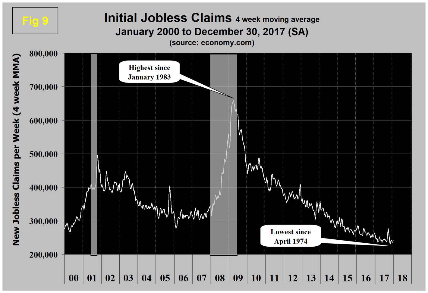 Initial claims for unemployment insurance, reported weekly by the Department of Labor, flattened in 2017 with the exception of the hurricane-driven spike. New claims are at the lowest level since 1974. In the week ending Dec. 30, initial claims were 250,000 with a four-week moving average of 241,750 claims. This marks the longest streak since 1973 of initial claims below 300,000 (Figure 9).