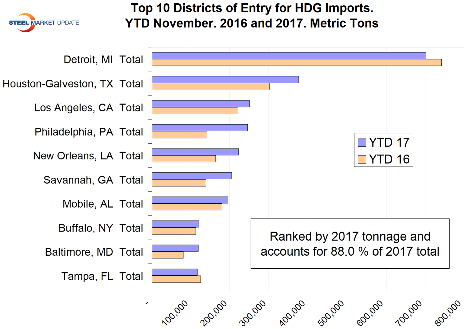 The table included here (click to enlarge) is a small part of the detailed analysis of HDG tonnage. The bar graph shows the tonnage that entered the top 10 districts in year-to-date November for 2016 and 2017 ranked by 2017 tonnage. These 10 districts account for 88.0 percent of the grand total in 2017. Detroit received the most tonnage through November 2017 followed by Houston, Los Angeles and Philadelphia.