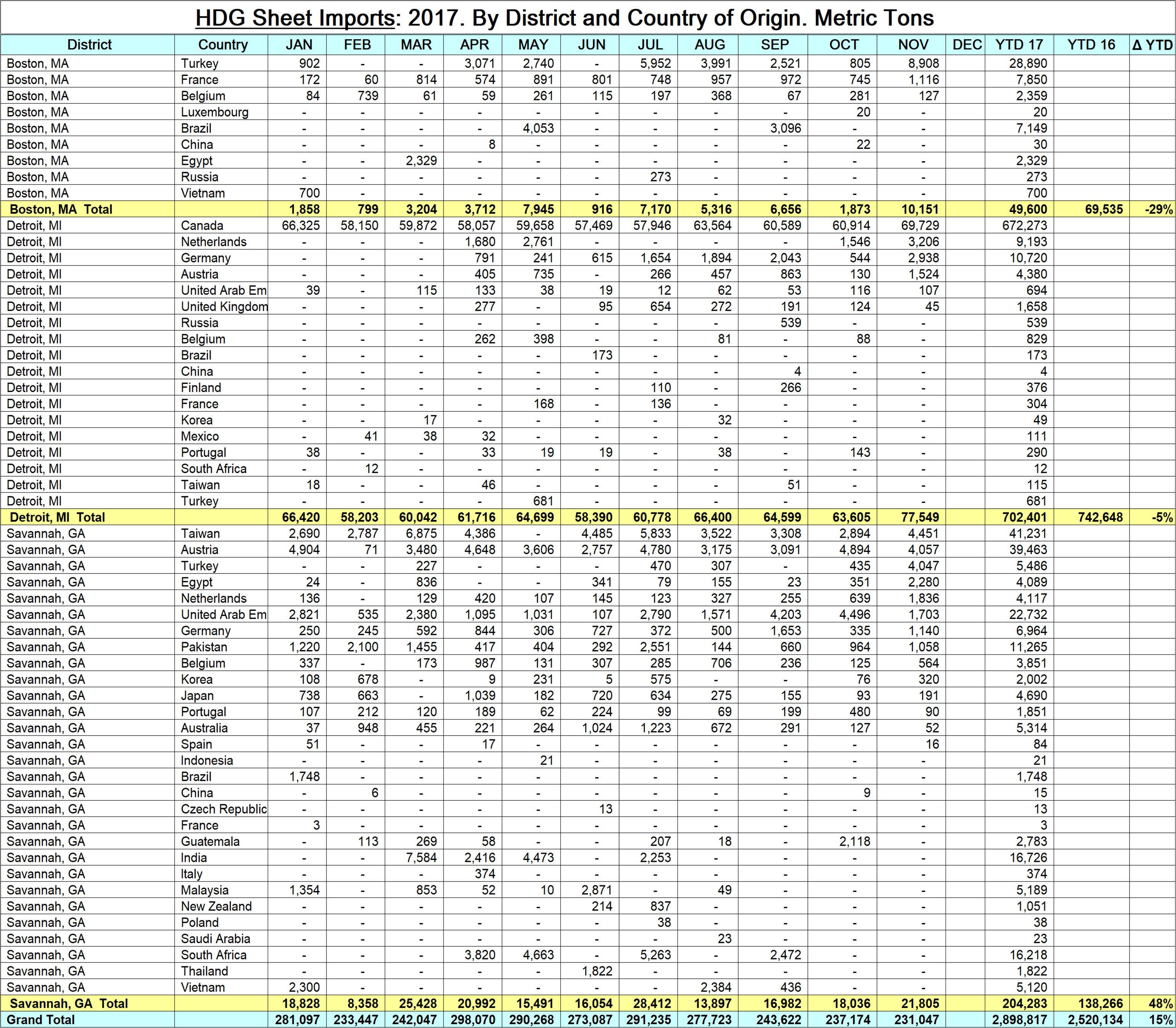 The data in these detailed reports is compiled from tariff and trade data published by the U.S. Department of Commerce and the U.S. International Trade Commission. Our other import reports are sourced from U.S. Department of Commerce, Enforcement and Compliance, aka the Steel Import Monitoring System. In the development of these reports by district and source country, we have discovered that the SIMA data for HRC and CRC contains some high-alloy steel such as stainless and tool steel, which have been misclassified at the ports. These alloy steels are not included in our detailed reports, which results in a small discrepancy between the two data sets, for CRC in particular and for HRC to a lesser degree.