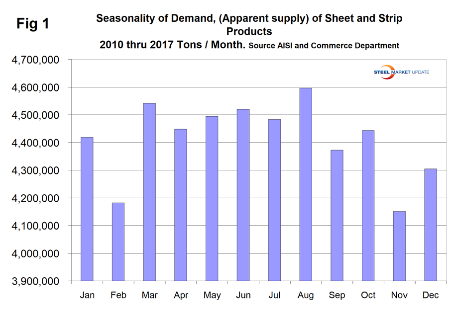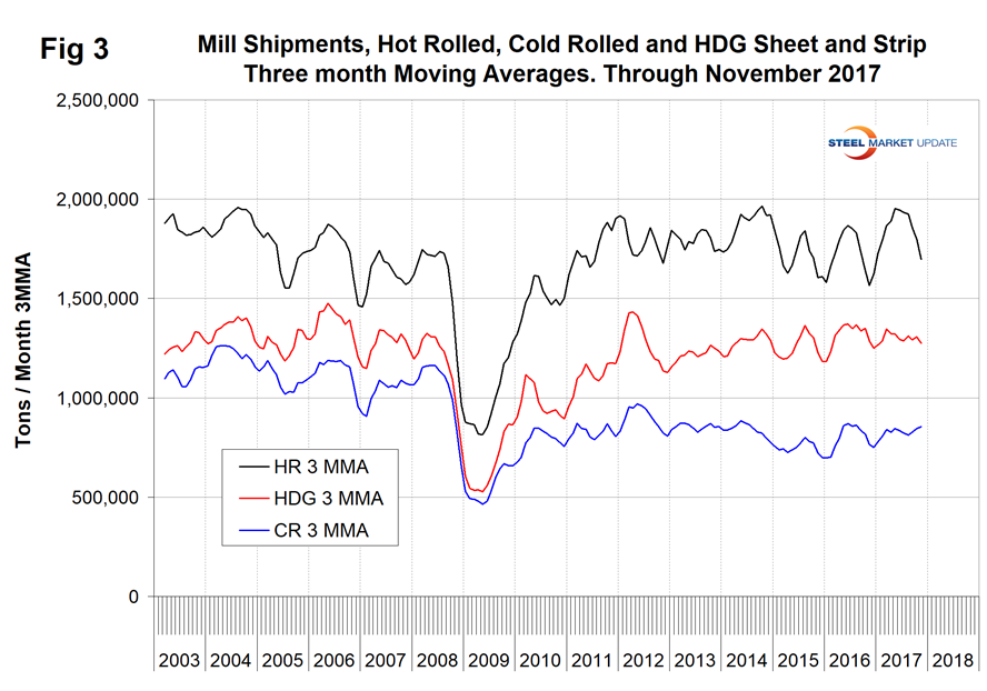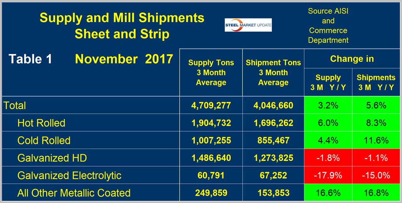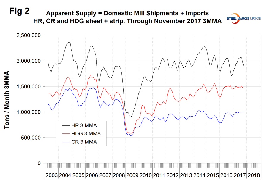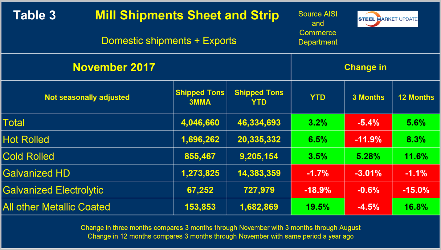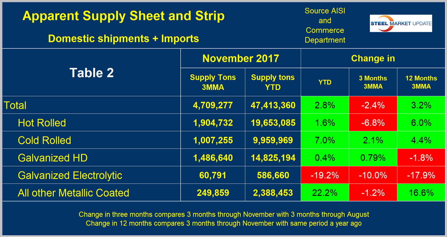 Apparent supply is defined as domestic mill shipments to domestic locations plus imports. In the three months through November 2017, the average monthly supply of sheet and strip was 4.709 million tons, up by 2.8 percent year to date but down by 2.4 percent in the three months through November compared to three months through August. There is no seasonal manipulation of any of these numbers. By definition, year-over-year comparisons have seasonality removed, but 3M/3M comparisons do not. Table 2 shows the change in supply by product on this basis through November.