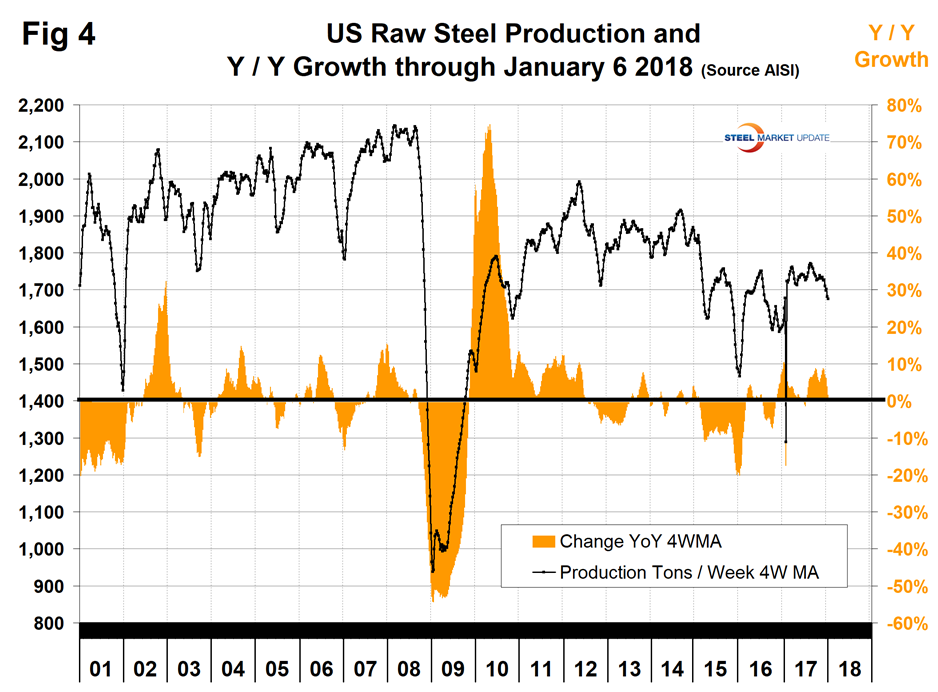 SMU Comment: One problem with this data is that it’s now well into January and the latest information we have for shipments and supply is for November. AISI puts out weekly data for crude steel production, the latest for which was the week ending Jan. 6. This provides the most current data for steel mill activity. Figure 4 shows the year-over-year change in weekly crude output on a four-week moving average basis.