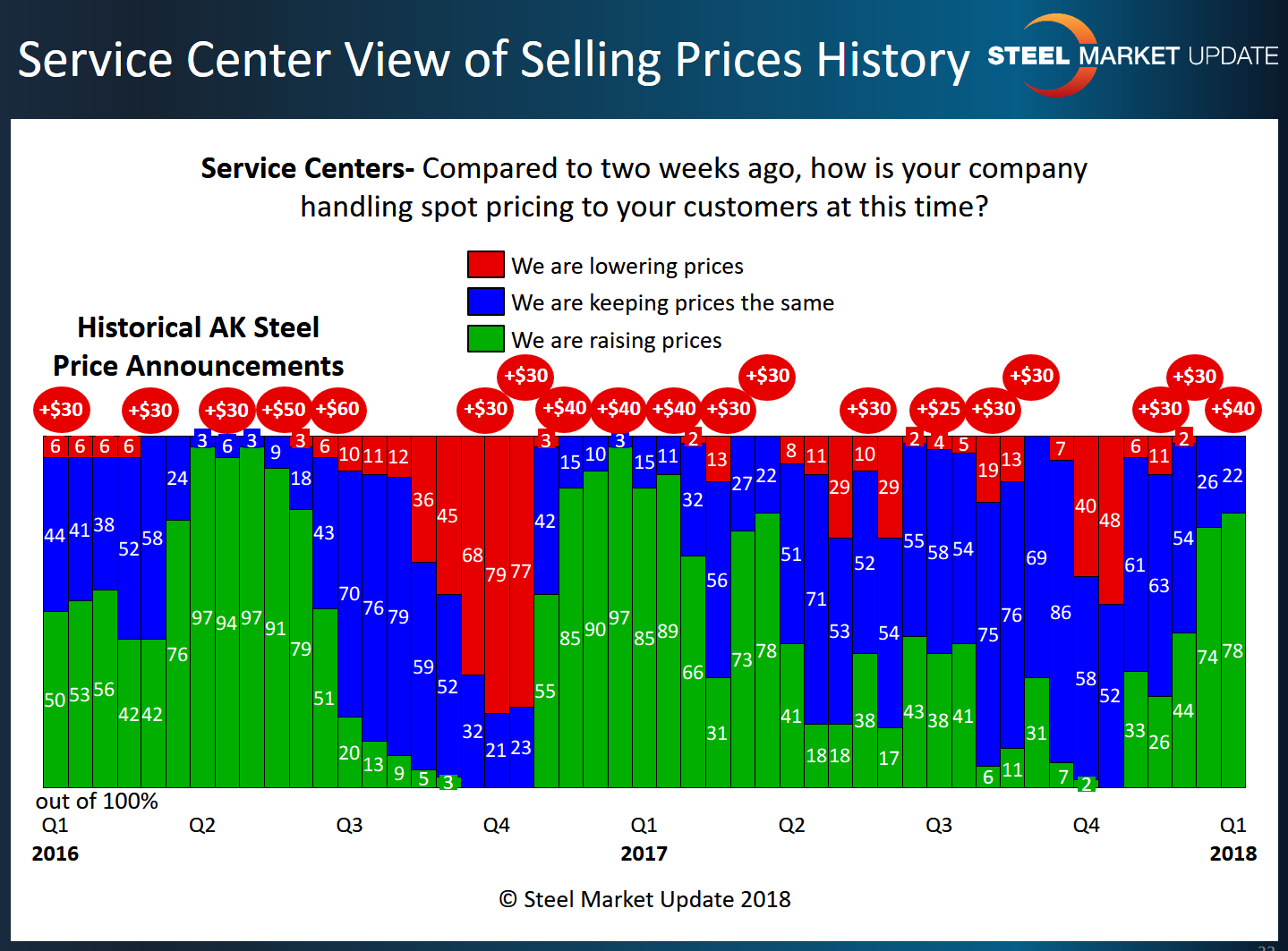 Service centers were even more bullish as 78 percent reported their company raising spot prices to their customers. The 78 percent is 34 percentage points higher than what we were reporting at the beginning of December 2017.