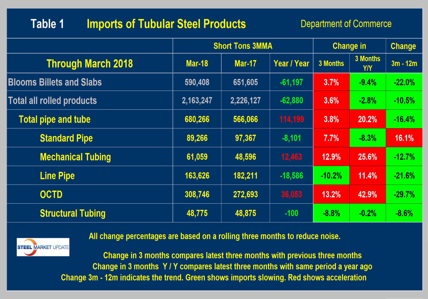 Total rolled steel imports increased by 3.6 percent, and tubular products by 3.8 percent, in the three months through March compared to three months through December 2017, but on a year-over-year basis tubulars were up by 20.2 percent, according to Steel Market Update’s analysis of federal Steel Import Monitoring and Analysis (SIMA) data.