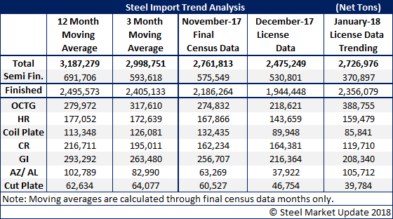 The U.S. Department of Commerce released import license data earlier today, which indicates that January steel imports are trending slightly higher than December’s 2,475,249 tons. Right now, based on the first 16 days of data, January is trending toward a 2.5 million to 2.7 million net ton month.