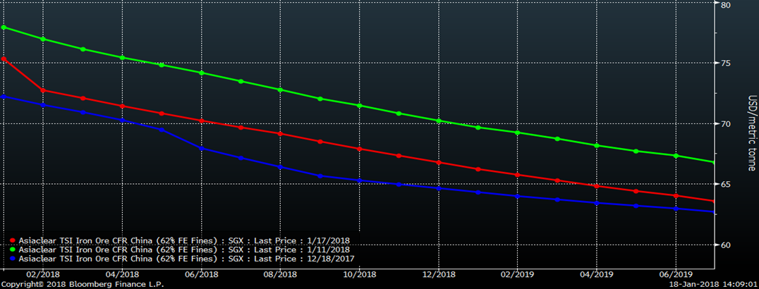 The iron ore futures curve moved lower, but saw little change to the shape of the curve.