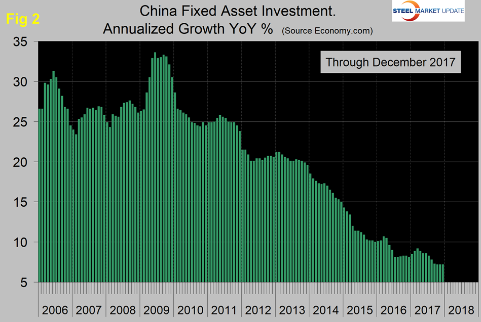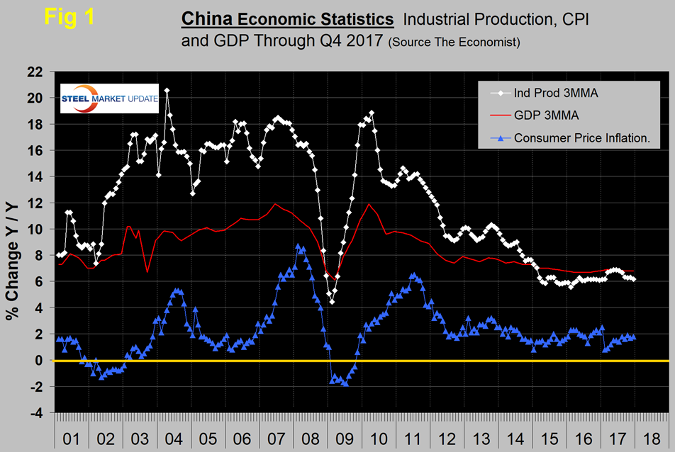 China’s steel production has continued to grow year over year, contradicting all the hoopla about production cuts, according to Steel Market Update’s latest analysis of Chinese government data. Once each quarter, we publish the official statistics for Chinese GDP, industrial production, consumer price inflation and fixed asset investment. Many analysts don’t believe these self-serving Party figures, but we include them in our reports because of the importance of China in the global steel scene. And these numbers are all that’s available. Figure 1 shows published data released this week for the growth of GDP, industrial production and consumer prices through the fourth quarter of 2017.