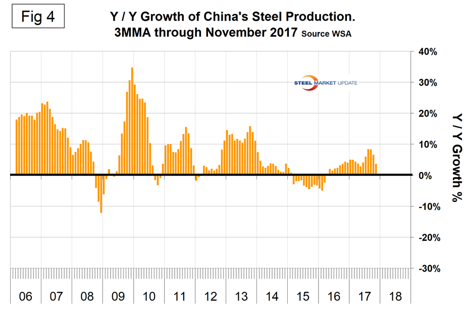 Figure 3 shows the 3MMA of China’s crude steel production through November when it accounted for 48.5 percent of global production. This was the lowest global share since February 2017. Each month, May through August set another all-time high for Chinese steel production, reaching 74.6 million metric tons in August. Production fell to 66.2 million in November. On Nov. 22, Platts reported that Tangshan, China’s biggest steelmaking city, had launched well-publicized steel output cuts the week before in an attempt to improve air quality in Beijing, Tianjin and 26 surrounding cities.