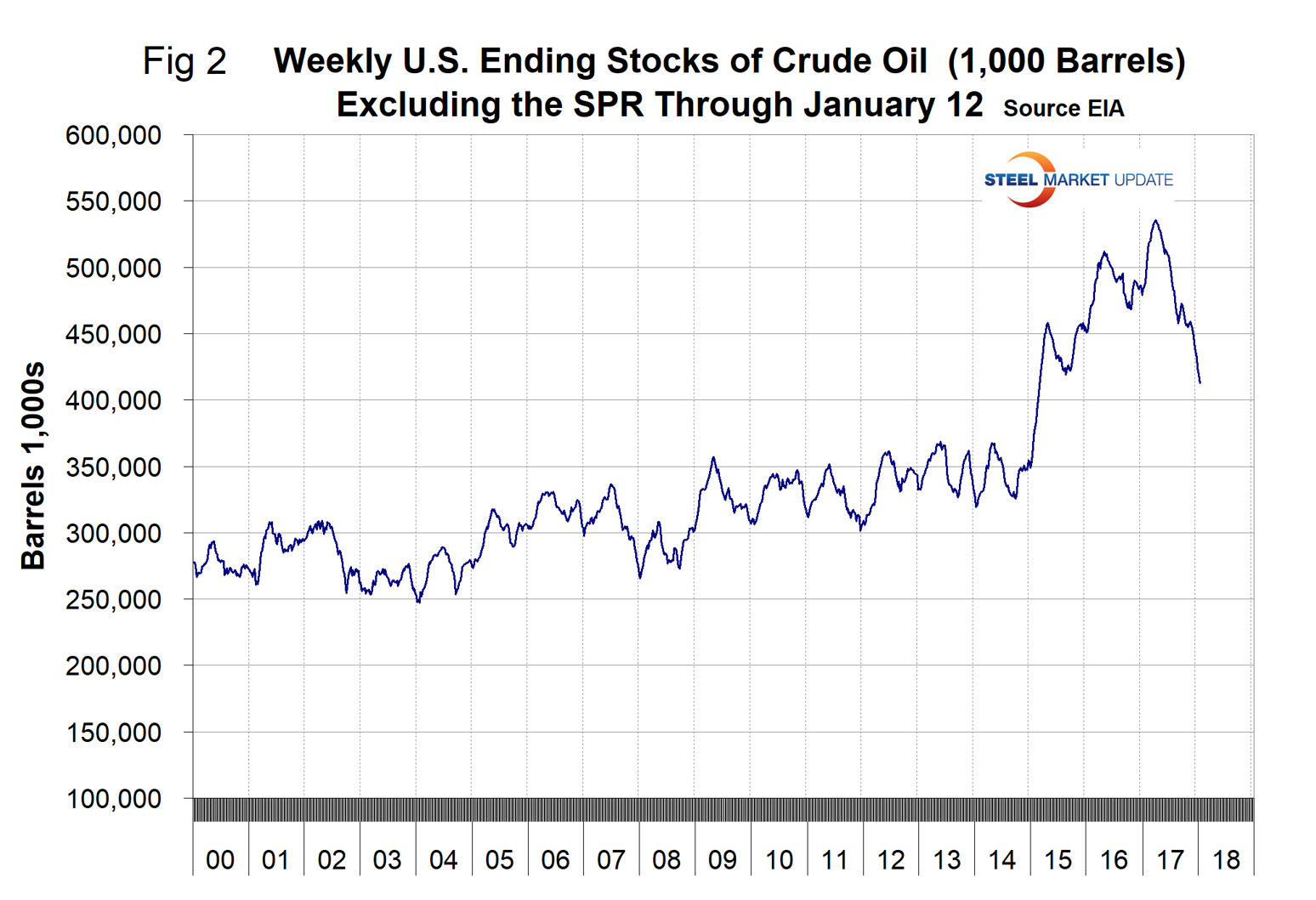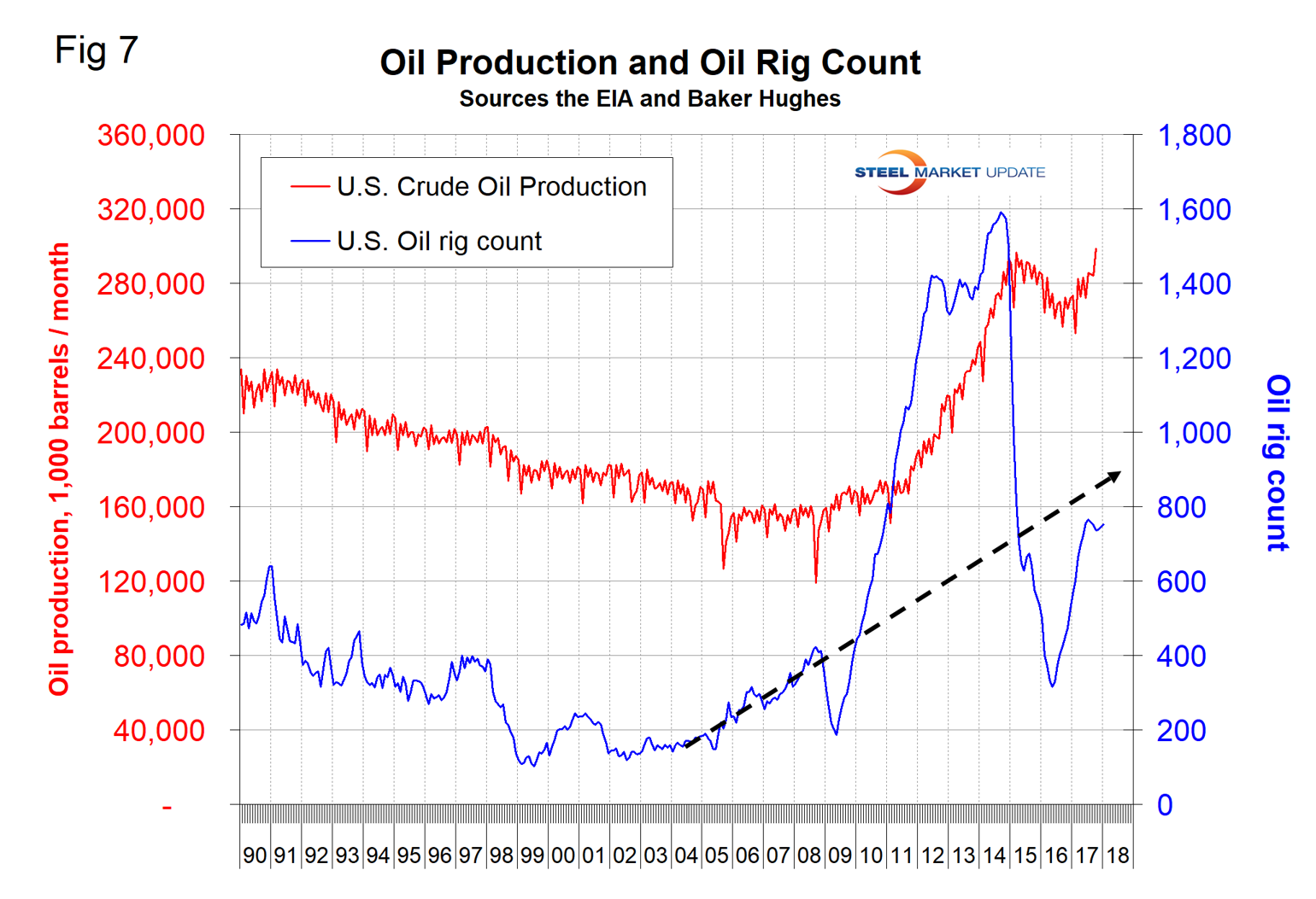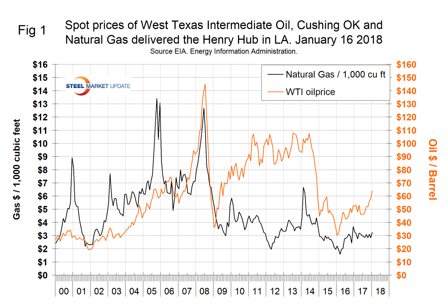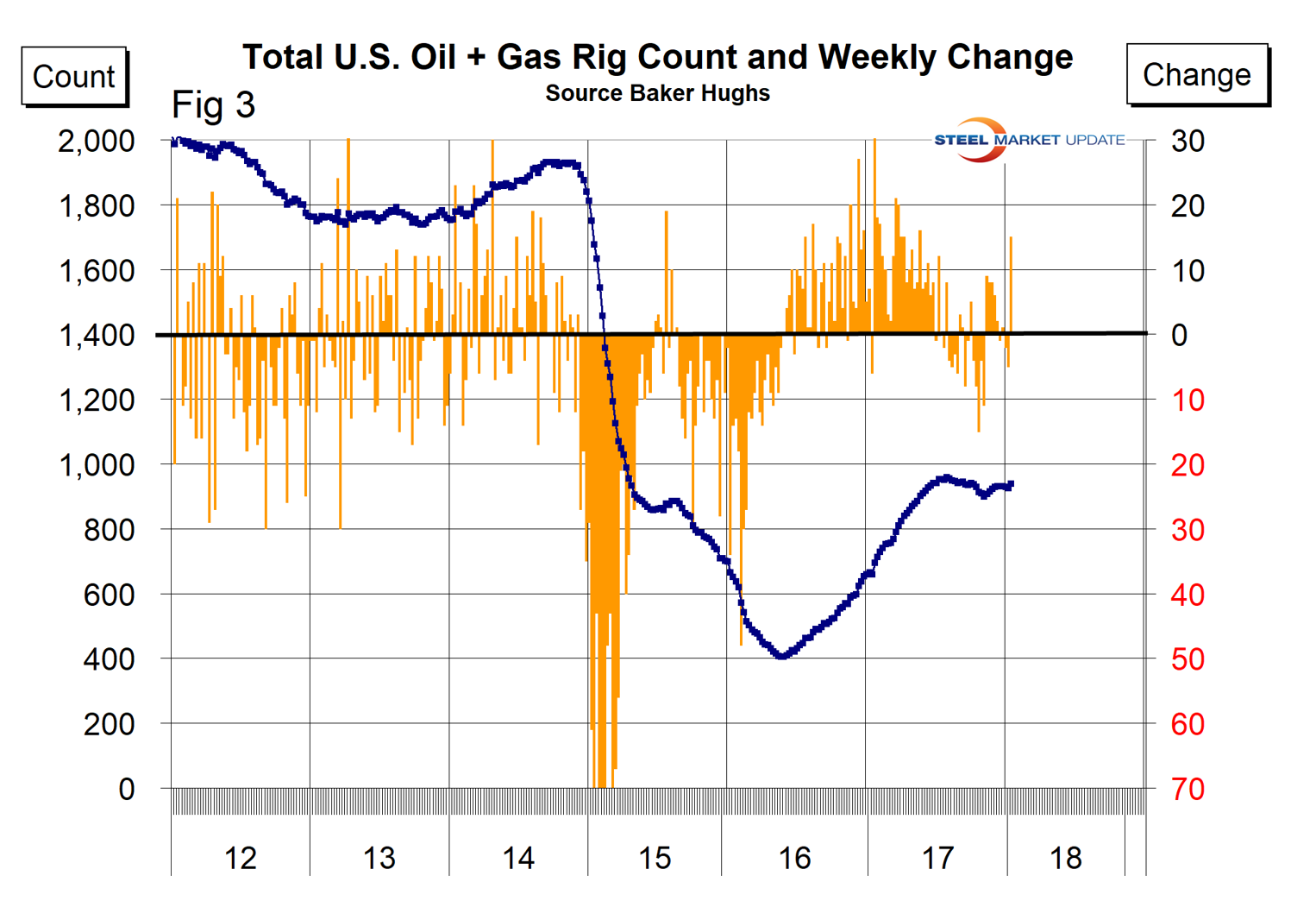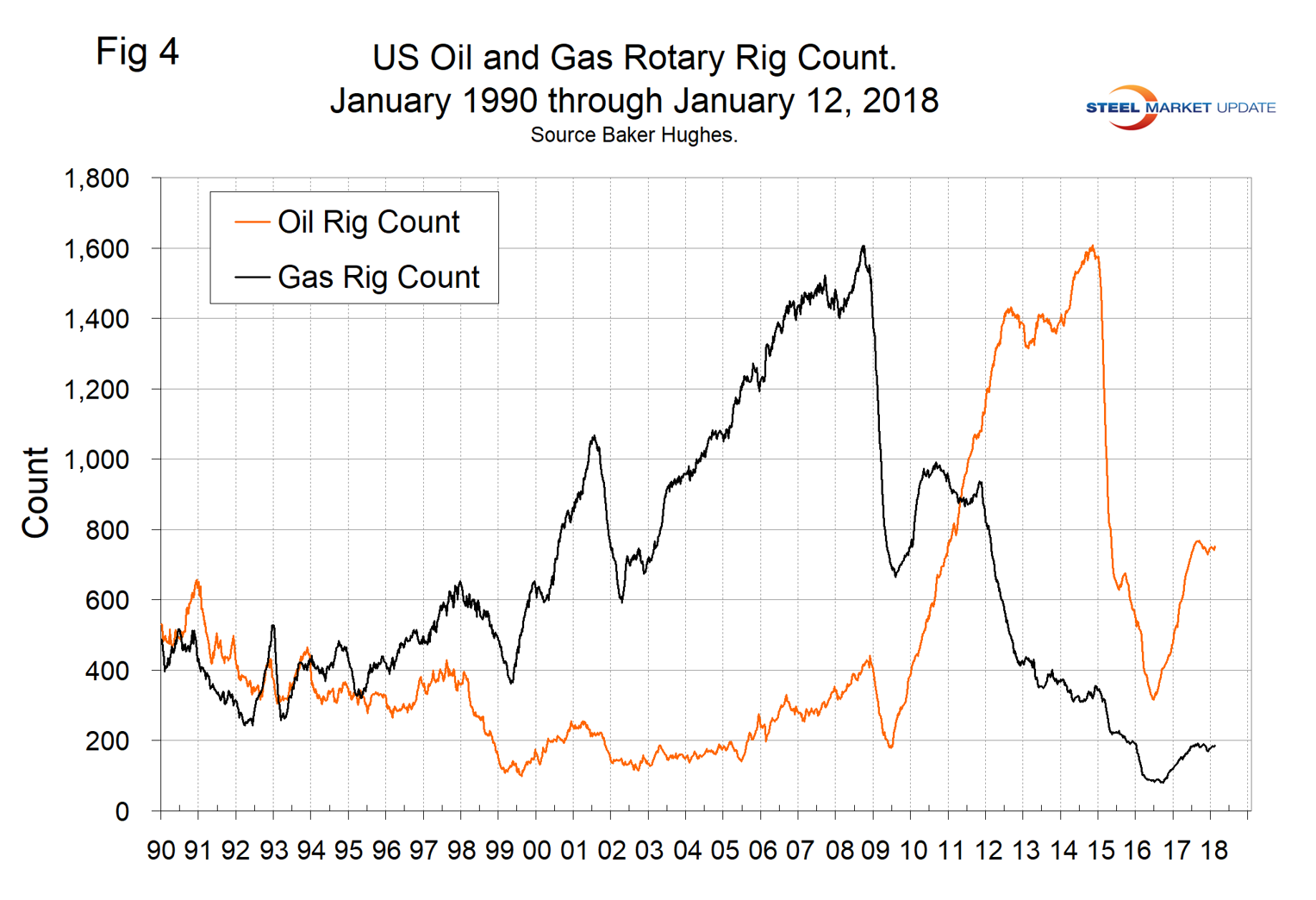 The spot price of West Texas Intermediate (WTI) broke through the $60 level on Dec. 29 for the first time since Dec. 18, 2014. It reached $64.22 on Jan. 12 before falling back to $63.82 on Jan. 16. The total number of operating rigs exploring for oil and gas increased by 15 in the week ending Jan.12, the largest weekly increase since March 12, 2017. The prices of oil and natural gas drive the consumption of energy-related steel products including oil country tubular goods, pipe fittings and well head equipment, among others. About 5.5 million tons of hot rolled sheet was used to make welded tubular goods in 2017 (not including OCTG).