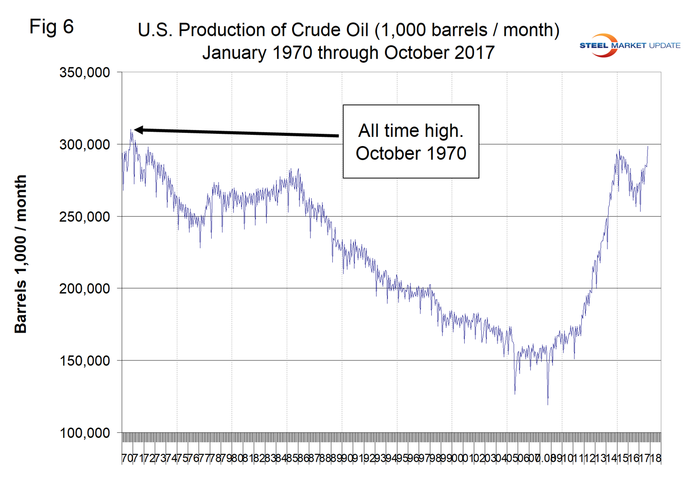 Figure 6 illustrates the monthly U.S. oilfield production of crude from January 1970 through October 2017 with an indication of the all-time high of 310 million barrels that occurred in November 1970. In the week ending Jan.12, production was 9.75 million barrels per day.
