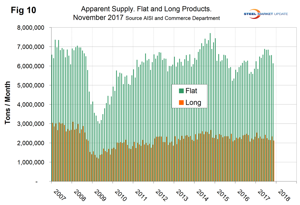 SMU Comment: In Figures 2-6, the white lines show tons-per-day shipments on a 3MMA basis. In the first few months of 2017, there was the normal seasonal increase in total shipments as December moved out of the rolling-three-month picture. However, there has been a big difference between products. Long products have enjoyed double-digit growth in the last nine months, but at the other extreme tubulars have not had a positive month since February 2015. Plate has grown strongly this year and has performed much more robustly than sheet, which had slightly negative year-over-year growth in both June and July but has improved every month since. These observations don’t jibe with our analysis of AISI and Commerce Department data. Figure 10 shows the total supply to the market of long and flat products based on AISI shipment and import data through November, which is the latest data available.
