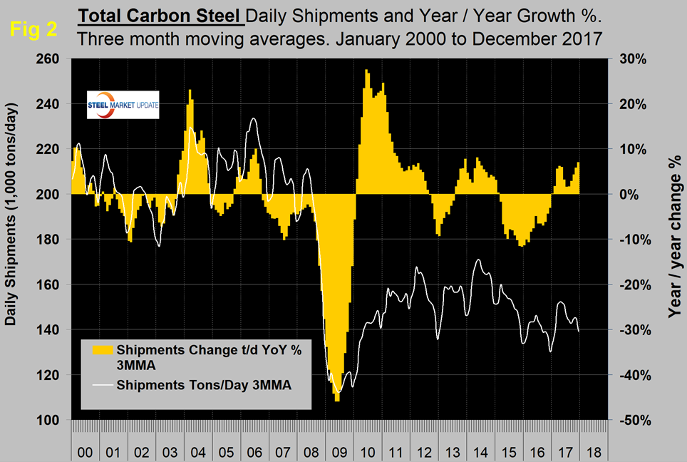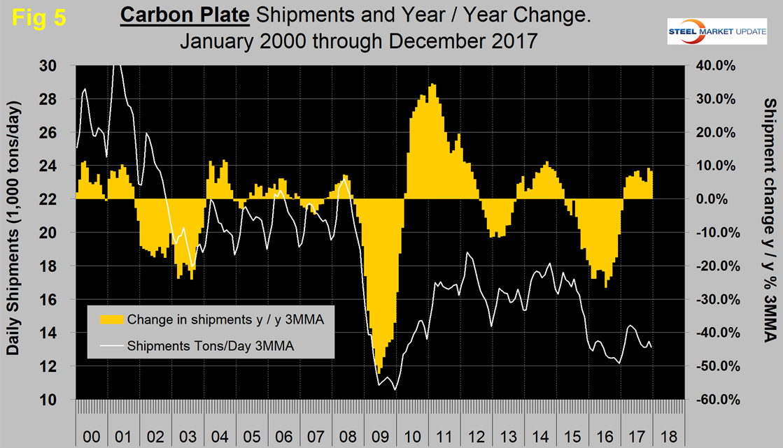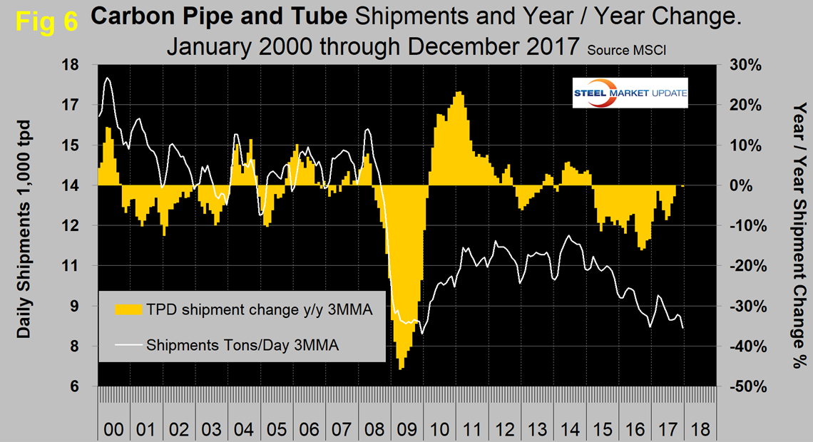 Shipments of all individual products except pipe and tube were up from December last year. Figure 2 shows the long-term trend of daily carbon steel shipments since 2000 as three-month moving averages (3MMA). The quickest way to size up the market is the brown bars in Figures 2-6, which show the percentage year-over-year change in shipments by product. In January on a 3MMA basis, there was positive year-over-year growth of 0.07 percent, which improved to 6.97 percent in December. These were the first positive year-over-year results since February 2015.