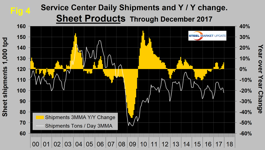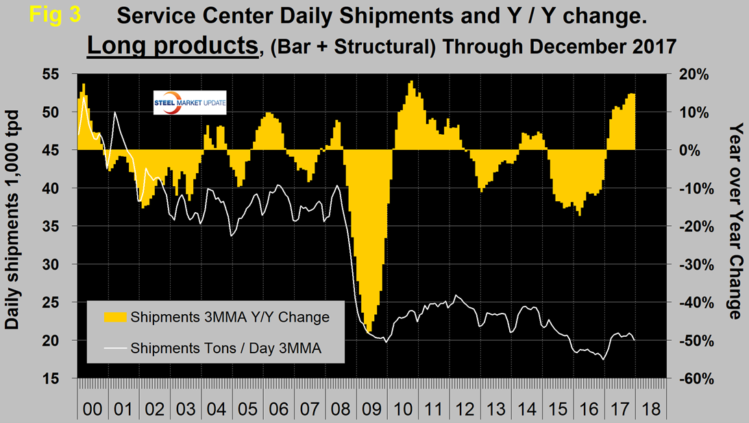 Figure 3 shows monthly long product shipments from service centers as a 3MMA with year-over-year change. Growth has improved this year and is now the highest it has been since late 2010. Eight months through December all exceeded a 10 percent year-over-year growth rate on a 3MMA basis, and in the latest data growth was 14.7 percent.