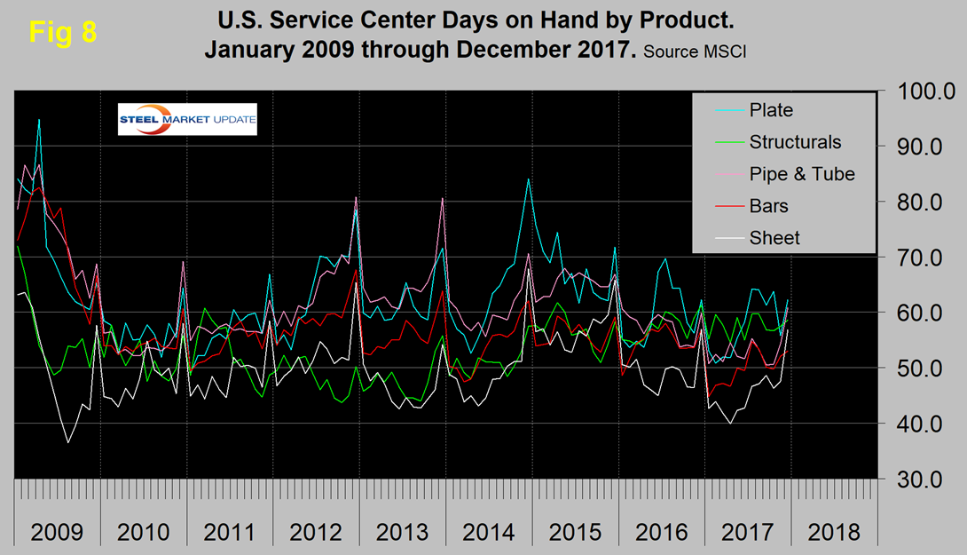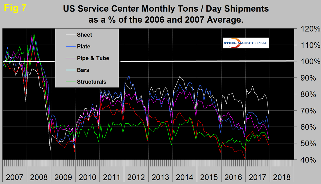 In 2006 and 2007, the mills and service centers were operating at maximum capacity. Figure 7 takes the monthly shipments by product and indexes them to the average for 2006 and 2007 to measure the extent to which shipments of each product have recovered. Each year, all products experience the December collapse and January pickup. In December, the total of carbon steel products was 56.9 percent of the average monthly shipping rate that occurred in 2006 and 2007. Structurals were 51.8 percent and bar was 48.8 percent. Sheet was at 67.1 percent, plate at 59.0 percent and tubulars at 52.4 percent.