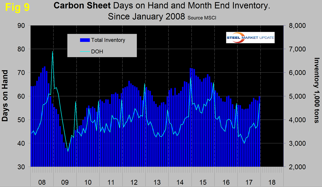 March closed with months on hand (MoH) of 1.94 for all carbon steel products, which was the lowest level in 13 years, since August 2004. This anomaly partly resulted from 23 shipping days, which is the maximum that ever occurs. We have now removed that effect as described in the notes below. Compared to the end of December last year, total carbon steel inventories were up from 49.7 to 57.3 days on hand (DoH). On a tonnage basis, total carbon steel inventories at the end of December were up by 7.5 percent year over year, but down by 7.7 percent compared to the end of December 2015. Compared to 2016, all products except tubular goods had an inventory tonnage increase. Figure 8 shows the DoH by product monthly since January 2009. Figure 9 shows both the month-end inventory and days on hand since January 2008 for total sheet products. In the last three years, both the year-end spikes and the mid-year troughs of sheet inventory tonnage have been declining.
