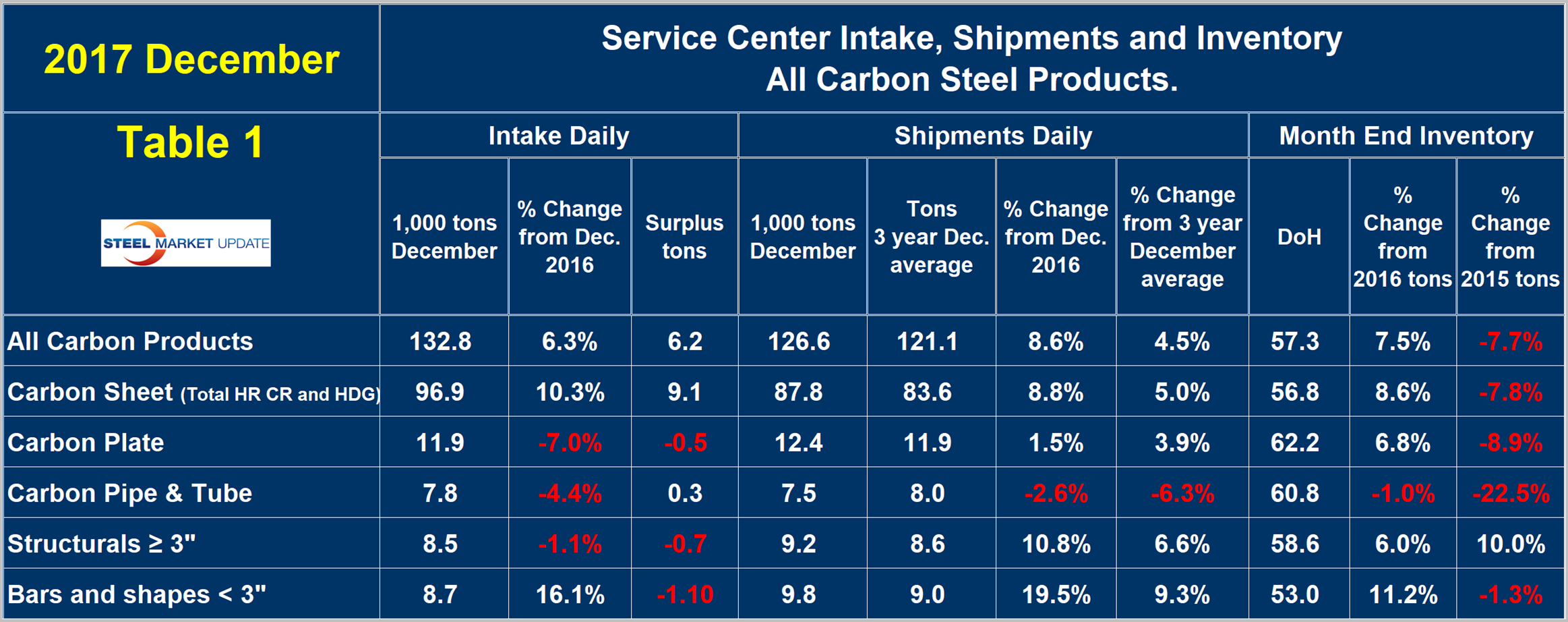 Daily shipments in December were 11.8 percent lower than in November. On average since 2009, December shipments have decreased by 13.1 percent; therefore, these latest numbers were seasonally better than the historical average for this time of year. Carbon steel shipments averaged 128,300 tons per day in December and days on hand as of the 31st were 57.3, which was up from 49.7 at the end of November.