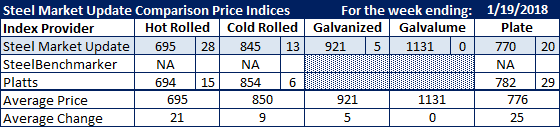 Benchmark hot rolled is quickly approaching $700 per ton (average) with SMU having the highest pricing while Platts, which was at $695.75 on Friday morning, dropped to $694 ($693.50) when we checked again over the weekend. Compared to the previous week, HRC prices were up $28 per ton on the SMU index and $15 per ton on the Platts index. SteelBenchmarker did not report steel price indices for the week as they only produce their numbers twice per month.