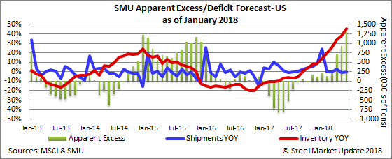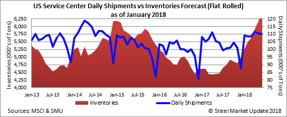 At the end of November, our proprietary model calculated that the domestic flat rolled service centers had 170,000 tons of excess inventories on their floors. Based on the four-year model mentioned above, we predicted the excess would grow to 412,000 tons by the end of December. However, with the lower receipts, we found the excess remained relatively stable at 126,000 tons.