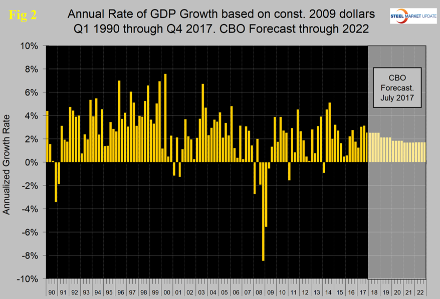 Figure 2 shows the headline quarterly results since 1990 and the July Congressional Budget Office forecast through 2022. Growth in the fourth quarter was exactly in line with the CBO forecast. The IMF forecasts global and national economic growth each April and October. In the October IMF update, the forecast of U.S. economic growth was revised down for each year through 2022. The 2017 growth forecast was revised from 2.31 percent down to 2.18 percent, while the 2018 forecast was adjusted from 2.52 percent down to 2.34 percent. Evidently, the IMF significantly underestimated the 2017 performance.