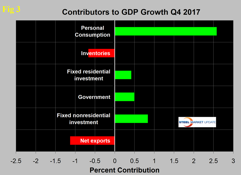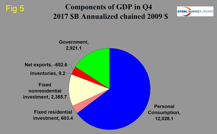 Figure 3 shows the change in the six major subcomponents of GDP in Q4 2017. Normally, personal consumption is the dominant growth driver, and this continued to be the case. Personal consumption includes goods and services, the goods portion of which includes both durable and non-durables. Inventories and the trade balance detracted from the fourth-quarter performance.