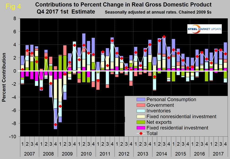 The contribution of inventories decreased from positive 0.79 percent in Q3 to negative 0.67 in Q4. Rising inventories are entered as a positive in the GDP calculation. Note that in the definitions at the end of this piece, inventories are not mentioned. Over the long run, inventory changes are a wash and simply move growth from one period to another. The contribution of personal consumption increased from 1.49 percent in Q3 to 2.58 percent in Q4. This was the best performance of personal consumption since Q3 2014. In the first three quarters of 2017, net exports made a positive contribution, influenced by the decline in the value of the dollar that continued through early September. We can expect this element of GDP growth to return to positive in the current quarter. The contribution of government expenditures was almost zero in the period Q2 2016 through Q3 2017, but made a 0.5 percent contribution in Q4.