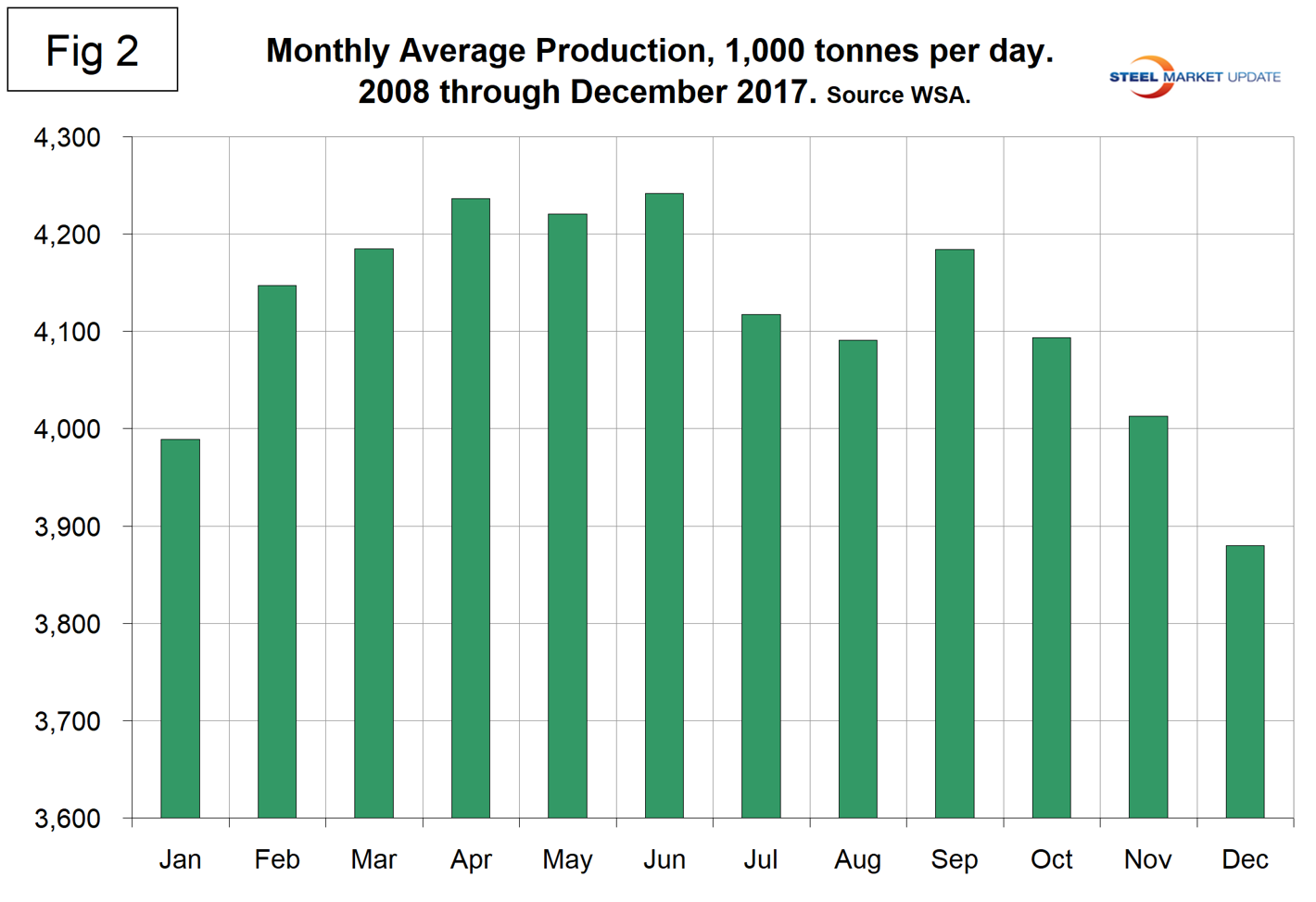 The summer slowdown that has occurred in each of the last seven years was delayed until November this year. On a tons-per-day basis, production in December was 4.454 million metric tons with a 3MMA of 4.559 million metric tons. The all-time high was in June 2017 at 4.695 million metric tons. In three months through December, production was up by 4.5 percent year over year. Capacity utilization took an erratically downward trajectory from mid-2011 through February 2016 when it bottomed out at 65.5 percent. Apart from the normal end-of-year seasonal decline, there has been a steady improvement since then. In each of the last 10 months, the 3MMA of capacity utilization has been greater than 71 percent for the first time since June 2015. Last December, the OECD’s steel committee estimated that global capacity would increase by almost 58 million metric tons per year between 2016 and 2018 bringing the total to 2.43 billion tons. That forecast is coming to pass as capacity is now 2.38 billion tons.