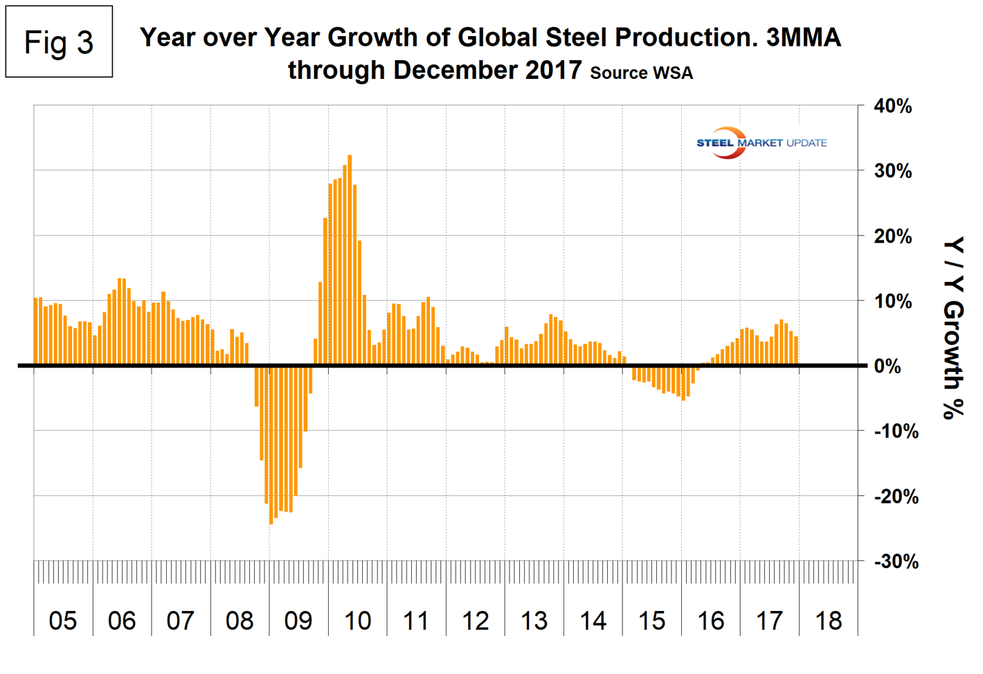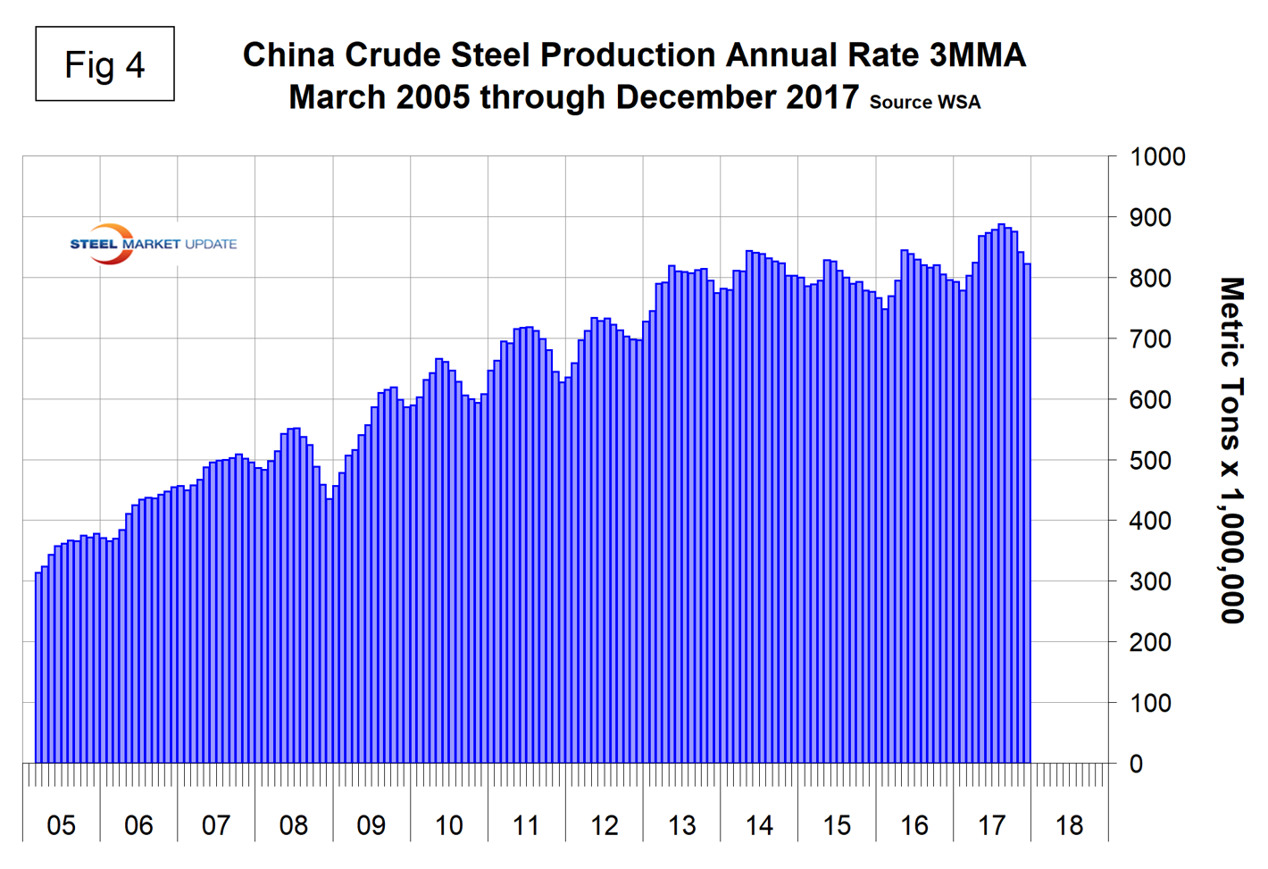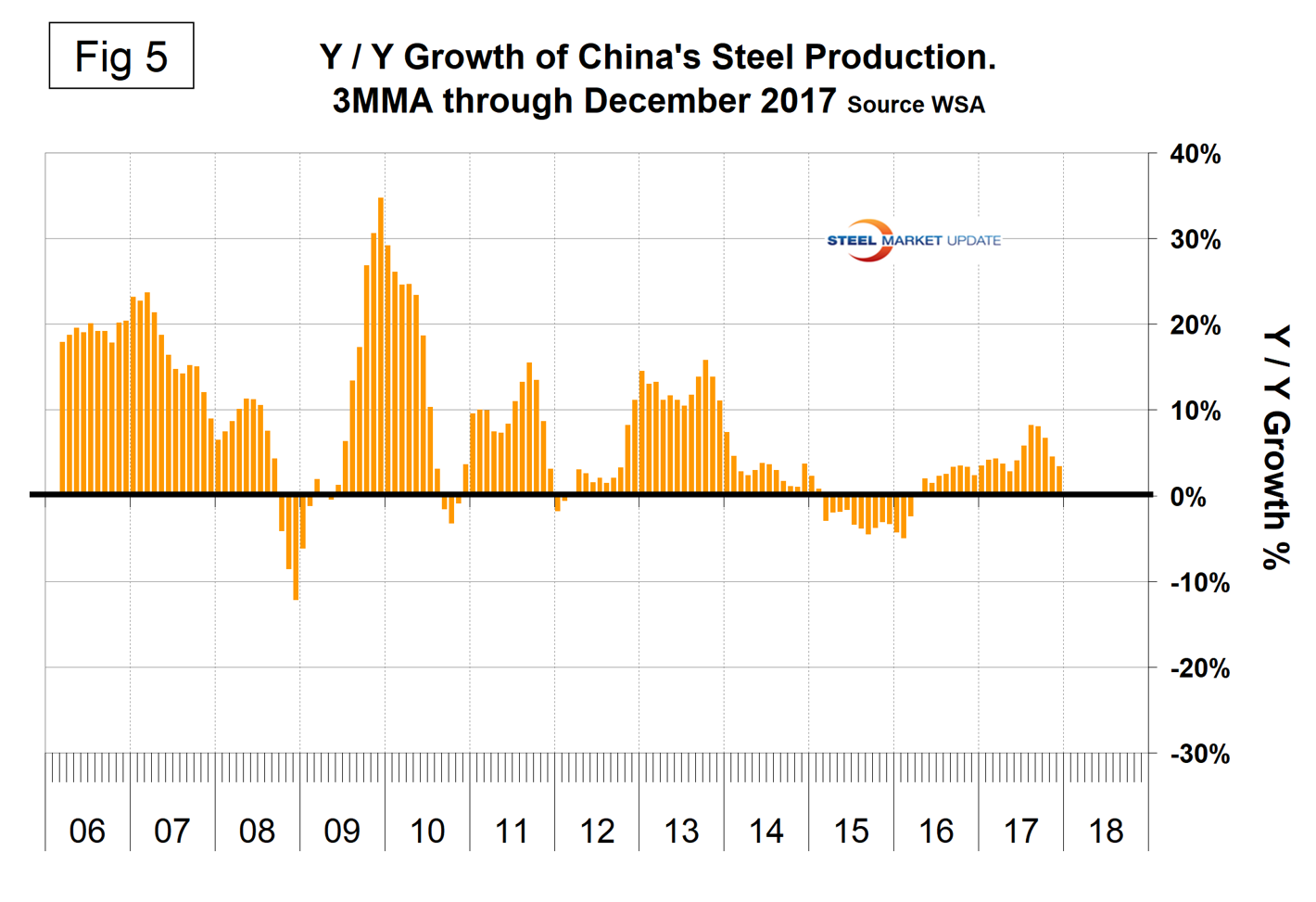 Figure 4 shows China’s production since 2005 and Figure 5 shows the year-over-year year growth. China’s production, after slowing for 13 straight months year over year, returned to positive growth each month in May 2016 through December 2017. Chinese production may slow again as a result of government-mandated cutbacks that began Dec. 15 in Tangshan and surrounding cities to improve air quality.