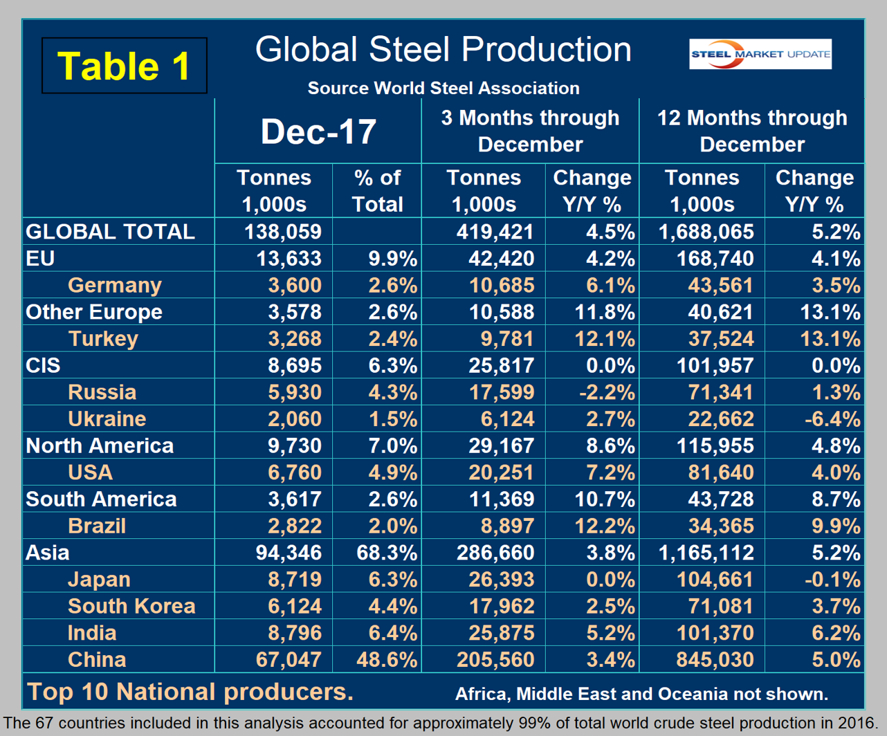 Table 1 shows that in three months through December year over year, every region except the CIS had positive growth in steel production. At the national level, only Russia contracted. Turkish production was at an all-time high in 2017 at 37.5 million metric tons. EAF output rose by 19 percent to 25.96 million tons and BOF production rose by 2.2 percent to 11.56 million tons.