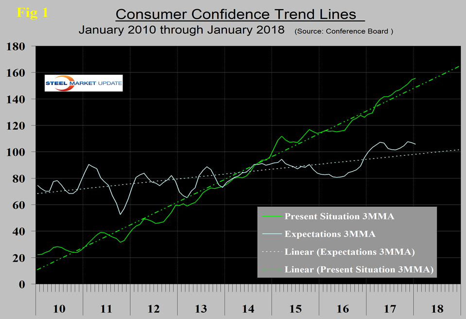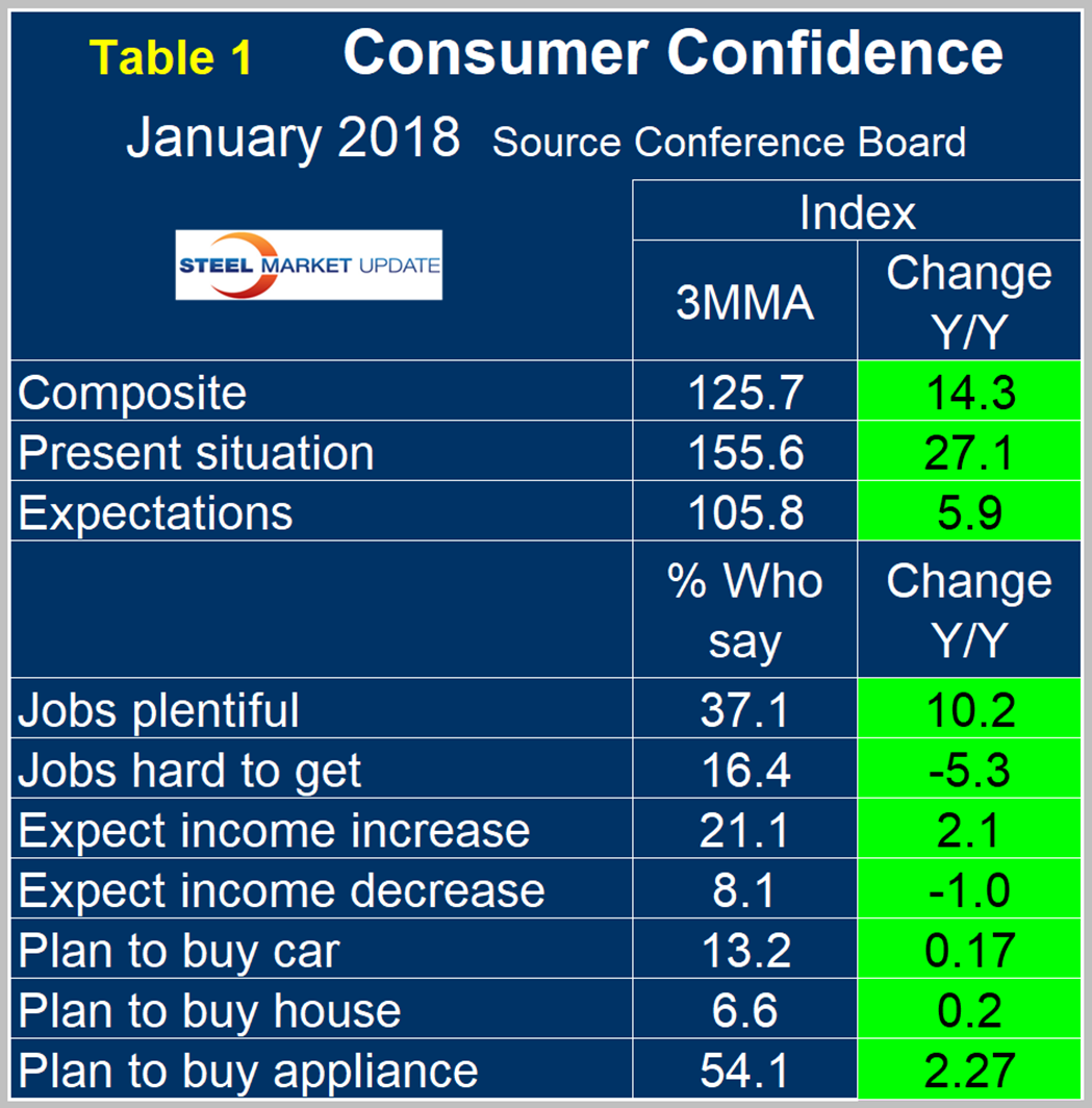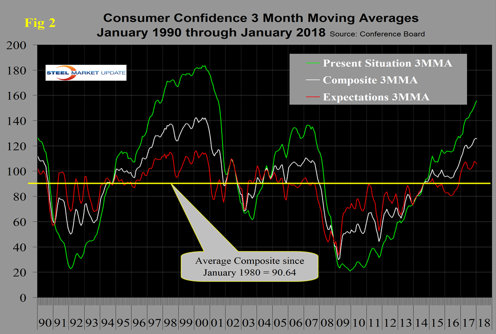 Consumer confidence dipped slightly in December, but recovered in January and remains at an extremely high level, according to The Conference Board’s January Consumer Confidence Survey. The composite value of consumer confidence in January was 125.4, up from 123.1 in December. Last July, the composite reached 120 for the first time since November 2000 and has been above that level ever since. The three-month moving average (3MMA) decreased from 126.0 in December to 125.7 in January, which was 18.3 points higher than in January last year. Consumer confidence is a driver of consumer spending, which is the largest component of GDP and ultimately drives a large portion of steel consumption.
