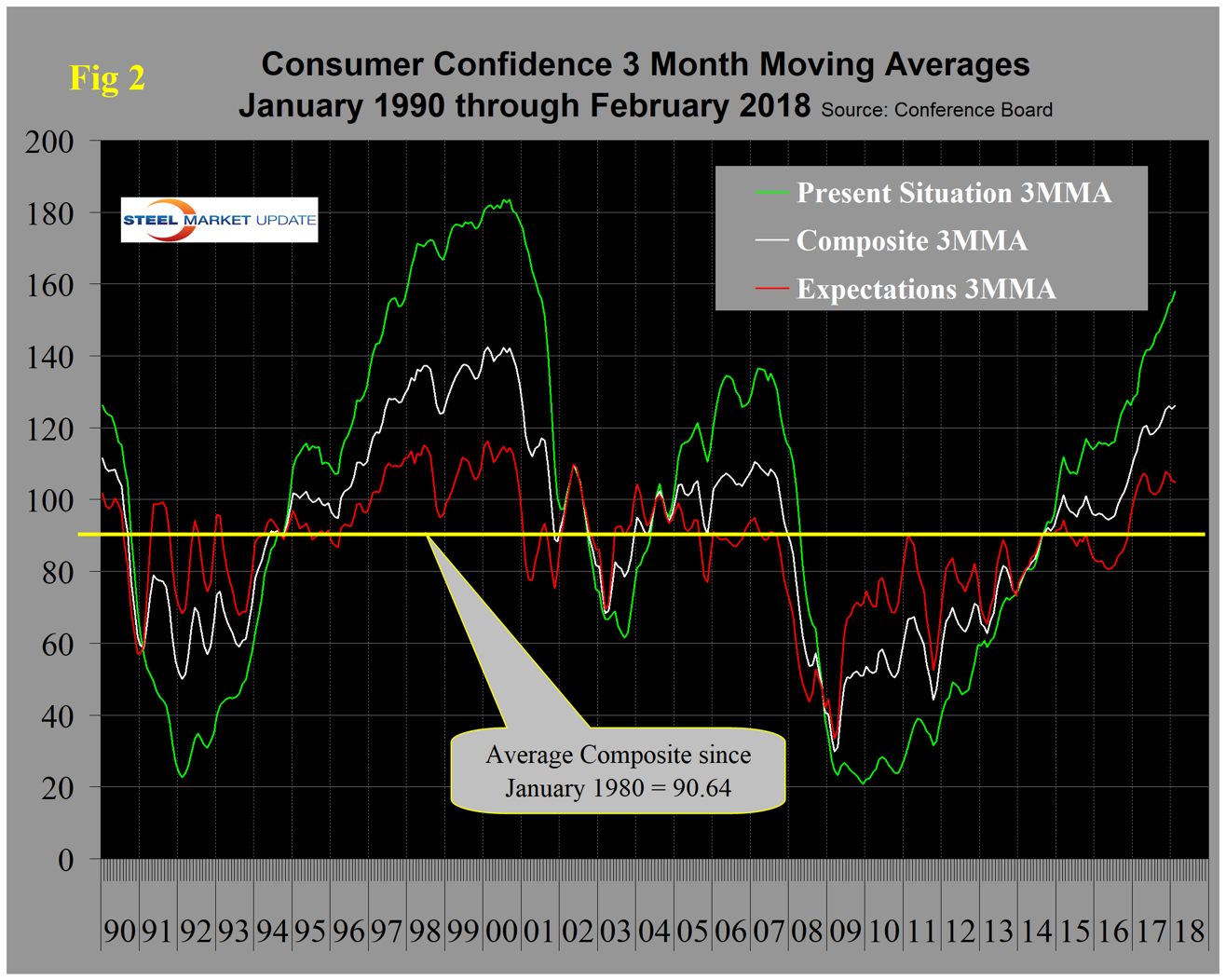 Consumer confidence dipped slightly in December, recovered partially in January and surged in February to the highest level since November 2000, according to The Conference Board’s February Consumer Confidence Survey. The composite value of consumer confidence in February was 130.8, up from 124.3 in January (1985=100). The three-month moving average (3MMA) increased from 125.3 in January to 126.1 in February, which was 12.4 points higher than in February last year. Consumer confidence is a driver of consumer spending, which is the largest component of GDP and ultimately drives a large portion of steel consumption.