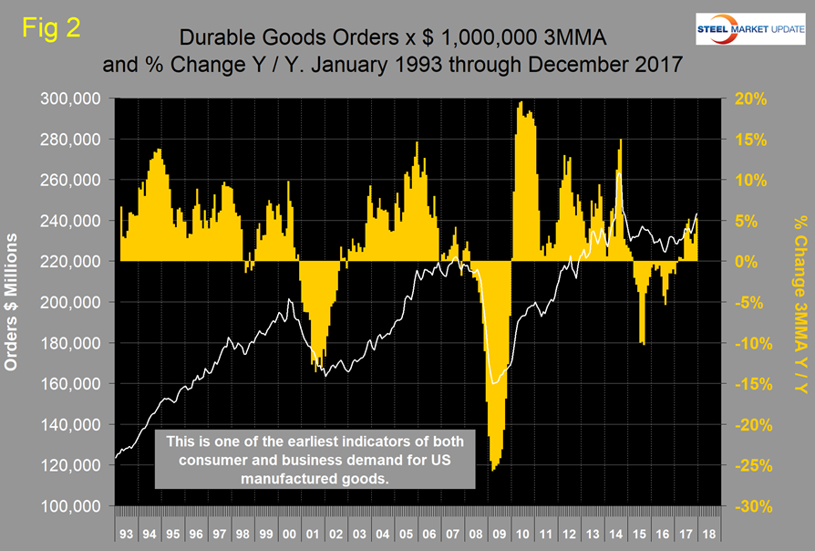 The U.S. Census Bureau announced last week that new orders for manufactured durable goods in December increased by $7.0 billion or 2.9 percent. Figure 2 shows the 3MMA of monthly orders for durable goods since January 2010 with the percent change year over year. March 2017 was the first month since April 2015 to have positive year-over-year growth. There has been an improving trend since August 2015 with a positive surge in the most recent data for June through December 2017.