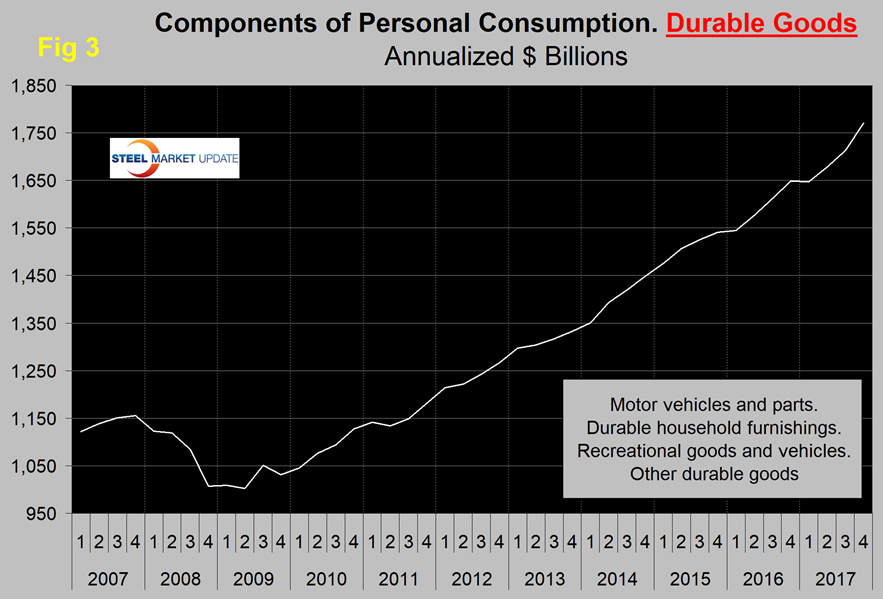 The first estimate of Q4 GDP came in at 2.57 percent annualized growth, which was down from 3.16 percent in Q3. A subcomponent of the quarterly data is durable goods, which is part of the personal consumption calculation. It therefore contains no military hardware or civil aircraft data. This is shown in Figure 3 and, presumably because of the exclusions just mentioned, looks nothing like Figure 2. Except for one quarter, Q1 2017, the durable goods portion of GDP has had positive growth every quarter since Q2 2011.