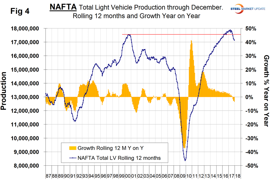 On a rolling 12-months basis year over year through December, light vehicle production in NAFTA decreased by 3.6 percent. Through December, growth declined for six straight months. These were the first months of contraction since May 2010. There has been a very gradual slowdown in growth for the last three years as indicated by the brown bars in Figure 4. The data source is Ward’s Automotive. We understand that the main hang-up in the NAFTA negotiations revolves around auto parts manufacture and final point of assembly. There is a huge movement of components and subassemblies in both directions across the southern border. Therefore, it is not known whether the Ward’s data exaggerates or deflates the national differentials.